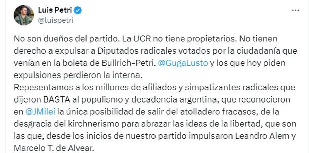 En su cuenta personal de la red social X, Petri aseguró que "no tienen derecho a expulsar a diputados radicales" que fueron votados por la ciudadanía y que estaban dentro de la boleta que él mismo lideraba junto a su par de Seguridad, Patricia Bullrich.