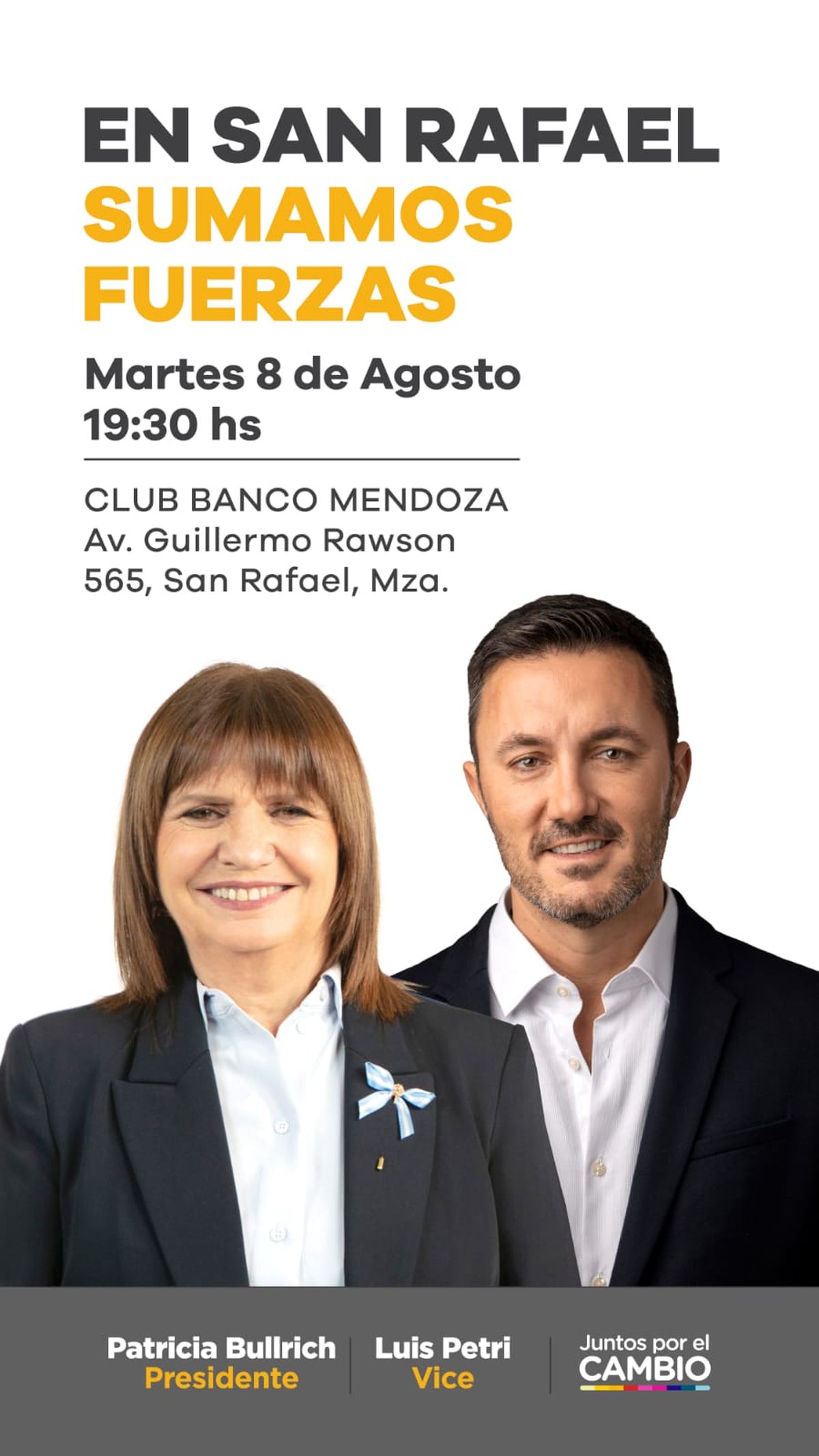 Para Petri y su equipo concluir la campaña electoral en San Rafael tiene un triple sentido: refuerza presencia en una comuna que según las encuestas se inclina por la fórmula que lidera Patricia Bullrich, fortalece a la militancia a menos de un mes de las elecciones a la intendencia del próximo 3 de septiembre y a la vez, cumple con la cábala que le rindió buenos frutos en las PASO provinciales.