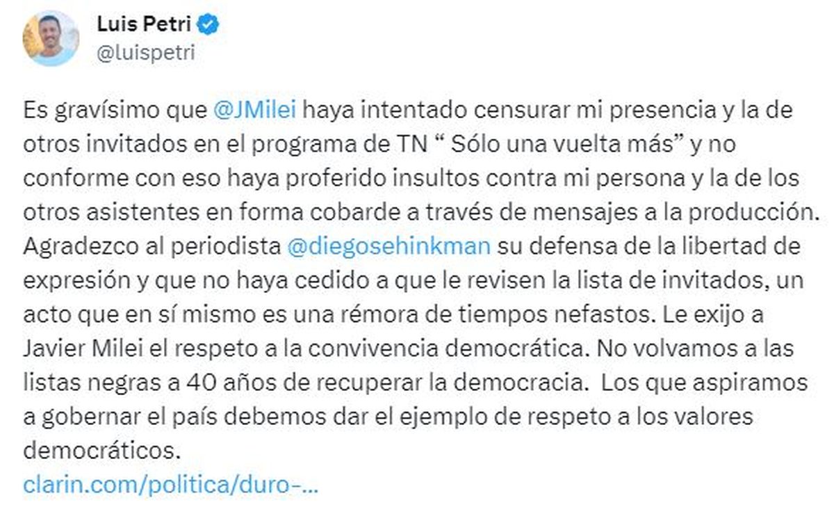 "Es gravísimo que Javier Milei haya intentado censurar mi presencia y la de otros invitados en el programa de TN 'Sólo una vuelta más' y no conforme con eso haya proferido insultos contra mi persona y la de los otros asistentes en forma cobarde a través de mensajes a la producción", opinó Petri a través de su cuenta de X (antes Twitter).