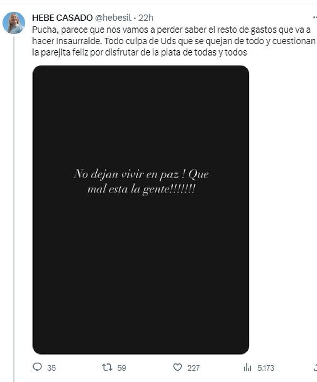 En cambio la próxima vicogobernadora provincial Hebe Casado ironizó sobre la acción de la modelo de borrar la publicación tras la ola de críticas: "Pucha, parece que nos vamos a perder saber el resto de gastos que va a hacer Insaurralde. Todo culpa de ustedes que se quejan de todo y cuestionan a la parejita feliz por disfrutar de la plata de todas y todos".