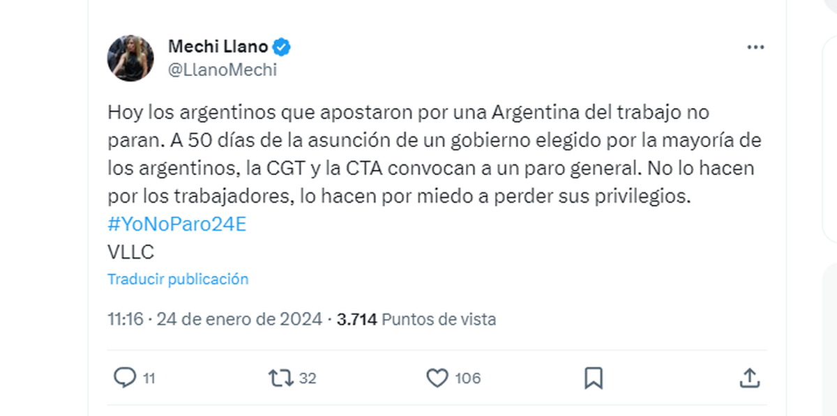 En su publicación, Llano hizo mención al mismo concepto que Petri: que los sindicalistas no quieren perder sus privilegios y que el gobierno de Milei aún lleva poco tiempo de gestión.