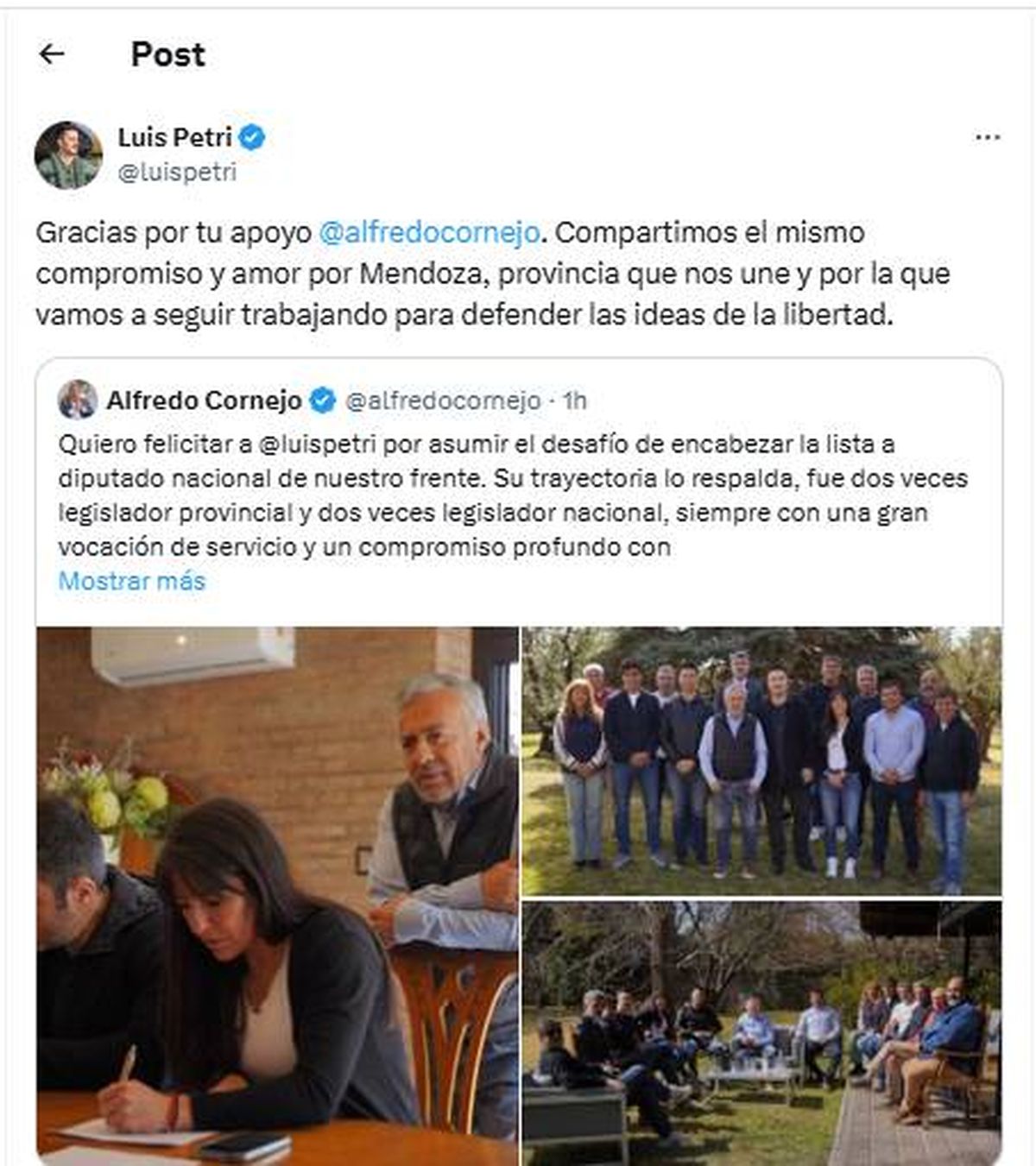 Y continúa: "La capacidad de trabajo y experiencia de ambos dirigentes hacen que su regreso al Congreso signifique la presencia de representantes que conocen en detalle su funcionamiento y que tienen un firme compromiso con la defensa de los intereses de Mendoza y de un proyecto nacional que necesita consolidarse para dar certeza, progreso y previsibilidad a un país que durante décadas perdió el rumbo".