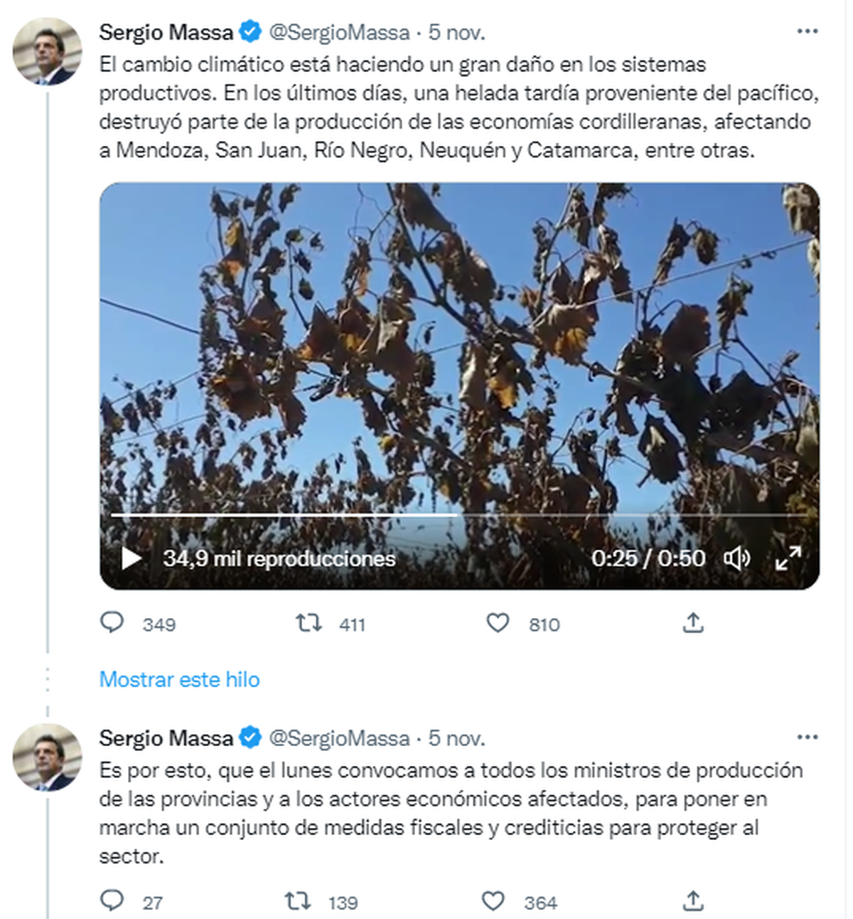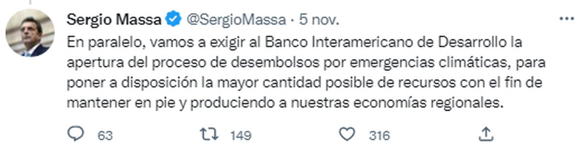 Massa señaló que a causa de esta heladas tardías, "estas provincias ven destruido el esfuerzo y el trabajo de sus productores y la vitalidad de sus economías regionales, desde uvas a cerezas, desde peras y manzanas, hasta zapallos y nogales, dejándolas en una situación grave y crítica".