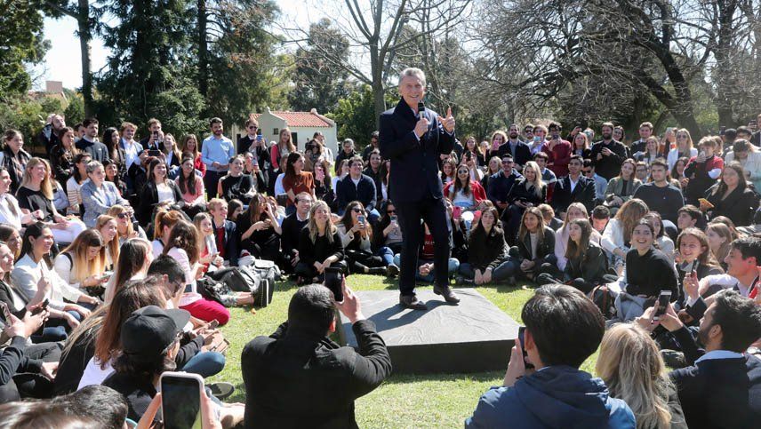 Macri, en modo de campaña, habló rodeado de jóvenes en el parque de la quinta presidencial, en lo que se conoce como formato 360 en medio de un sol radiante.