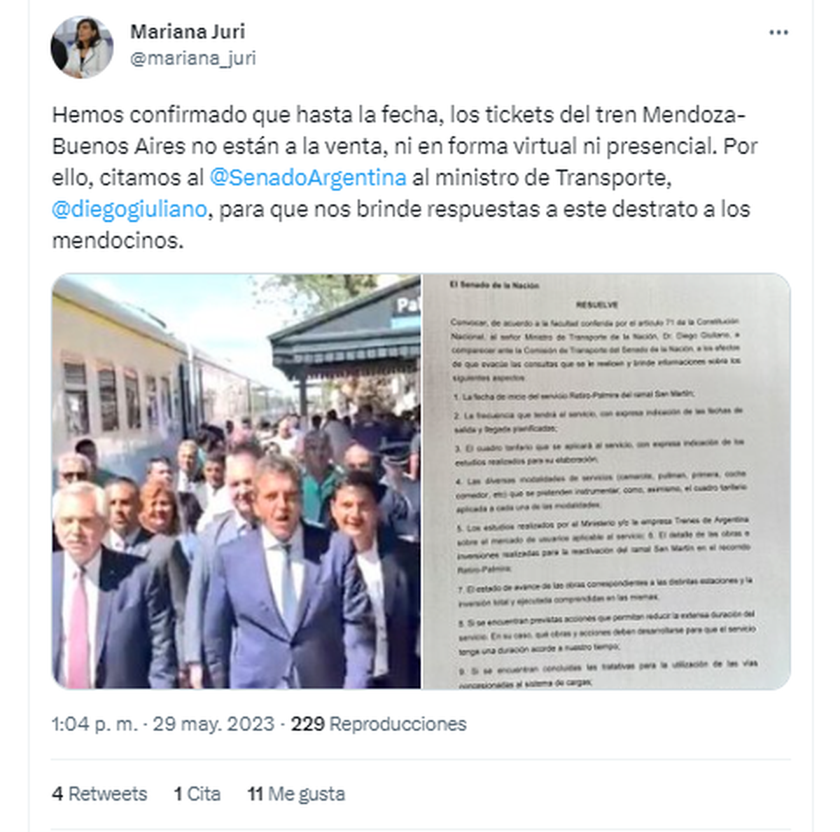 Además de las definiciones de cuándo estarán disponibles los pasajes de tren para los mendocinos, la senadora Mariana Juri también pretende que el ministro Diego Giuliano brinde detalles de las inversiones del gobierno nacional, no sólo para asegurarse la llegada del tren a Palmira, sino para darle la posterior conexión con el Gran Mendoza.