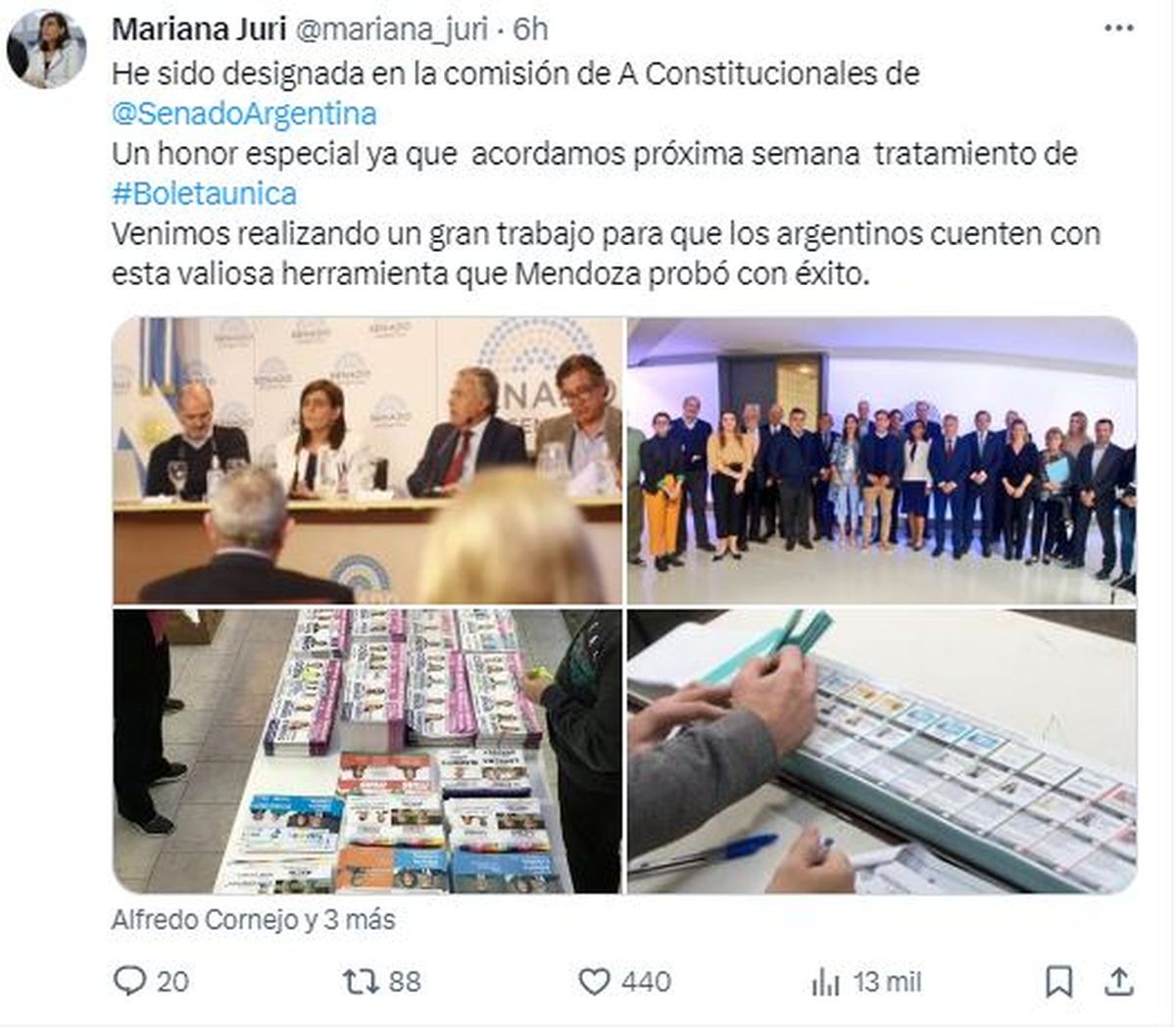 Ella misma lo comunicó: "He sido designada en la comisión de Asuntos Constitucionales del Senado de la Argentina. Un honor especial ya que acordamos para la próxima semana el tratamiento de Boleta Única. Venimos realizando un gran trabajo para que los argentinos cuenten con esta valiosa herramienta que Mendoza probó con éxito".