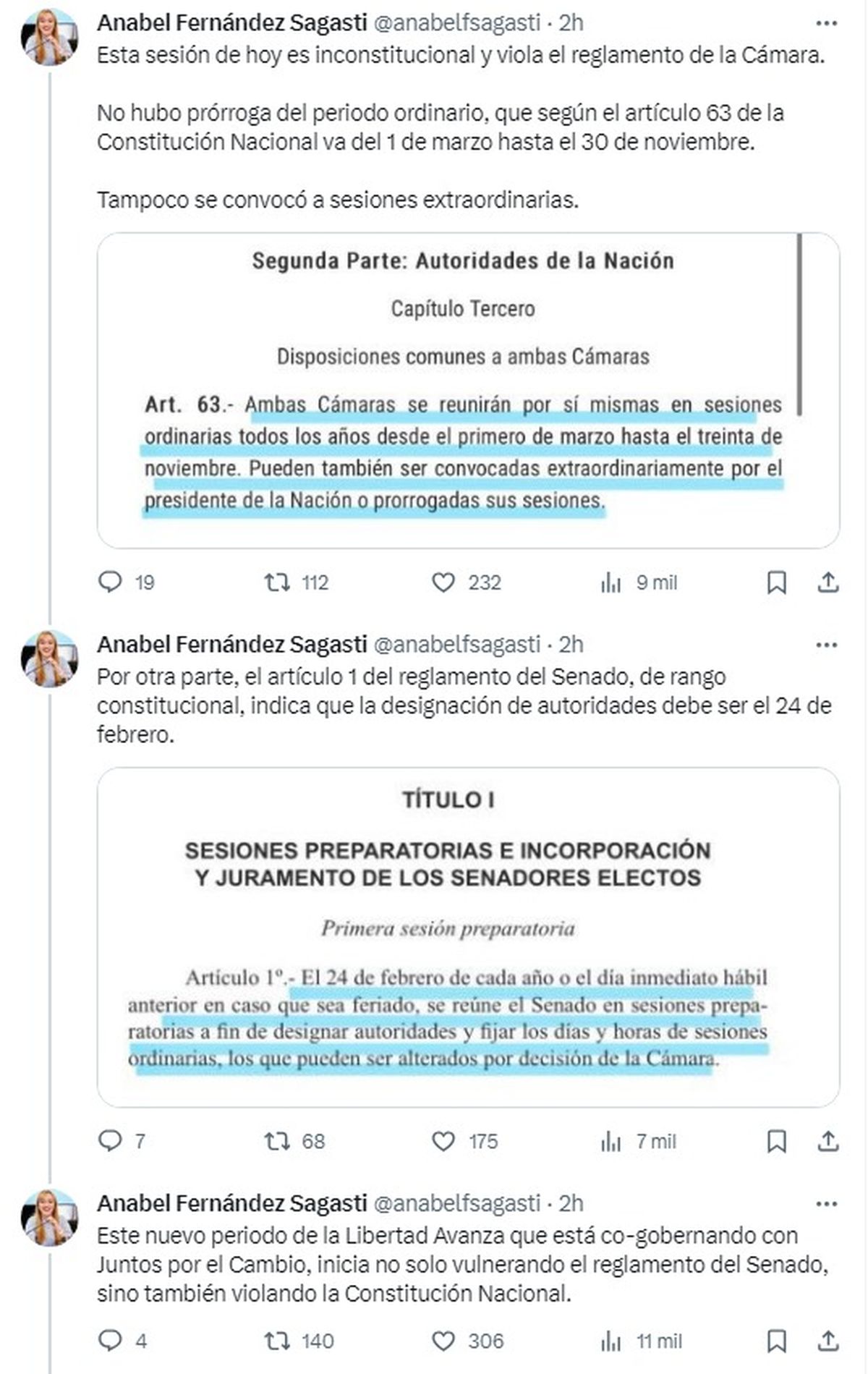 Se refería, claro, a la interpretación que hizo el peronismo. Para los justicialistas, al no haberse prorrogado el periodo ordinario de sesiones -que va del 1 de marzo al 30 de noviembre-, la sesión que convocó la nueva vicepresidenta de la Nación, Victoria Villarruel, sería inválida.