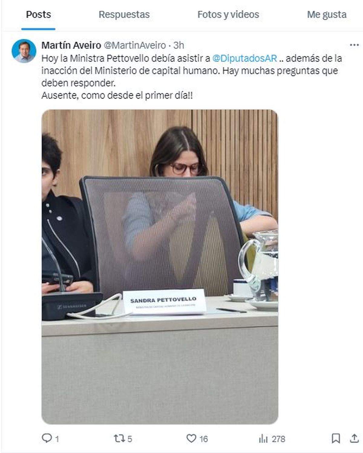 Aunque su ausencia no fue sorpresiva, la inasistencia de la ministra de Capital Humano, Sandra Pettovello, a la convocatoria de la Cámara de Diputados desató este martes una ola de críticas, entre ellas la del diputado nacional por Mendoza Martín Aveiro.