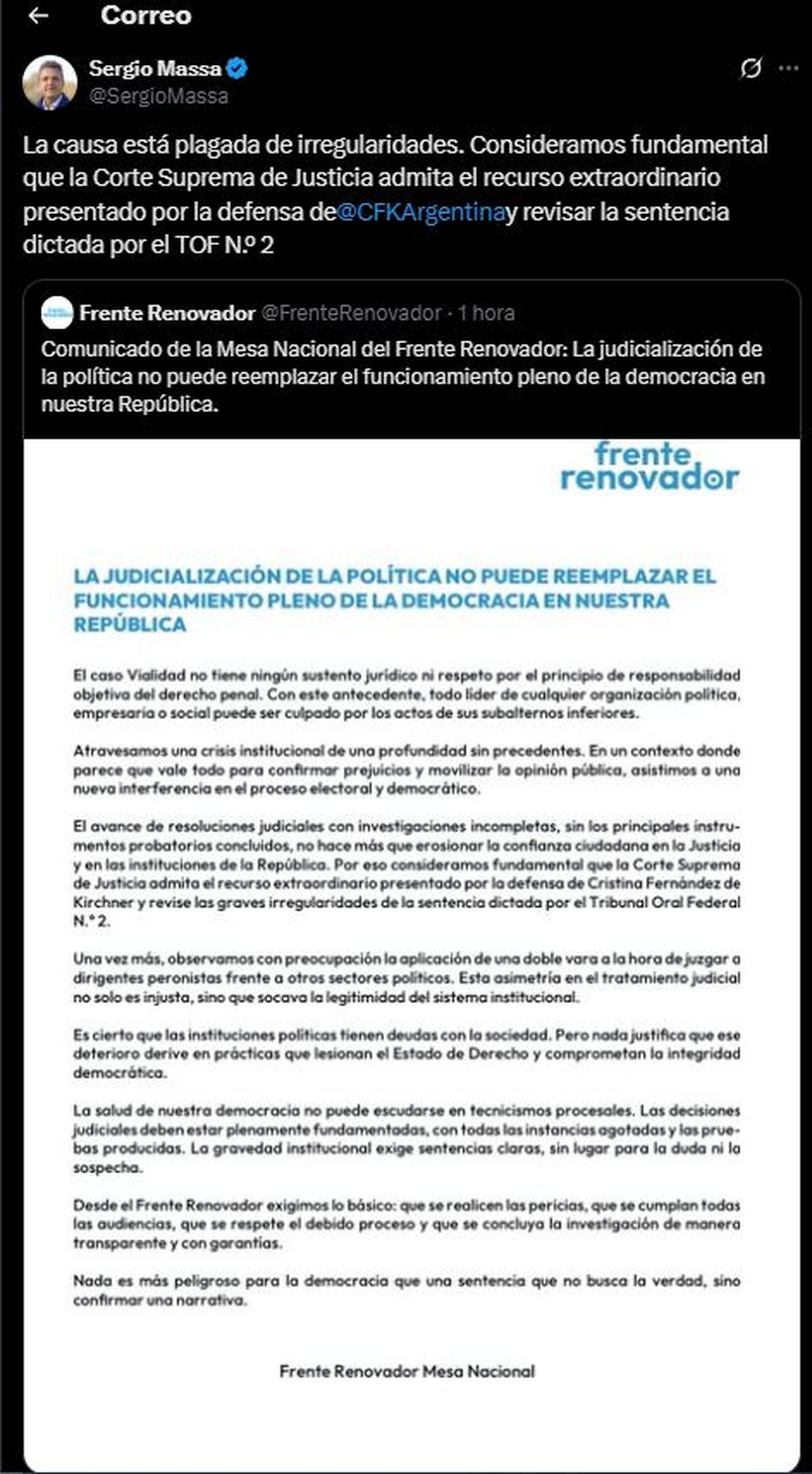 Respecto del encuentro con Massa, la charla telefónica de ayer entre ambos líderes sirvió para confirmar que el Frente Renovador brindaría su apoyo institucional a la expresidenta en caso de que se confirme el fallo. Ello quedó evidenciado en el mensaje que, luego del mediodía, publicó el exministro de Economía hablando de una causa "plagada de irregularidades".