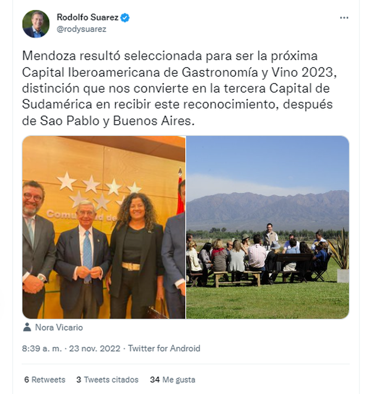 El gobernador Rodolfo Suarez celebró que Mendoza haya sido designada como Capital Iberoamericana de Gastronomía y Vino 2023. La elección la hizo la Academia Iberoamericana de Gastronomía y en el Gobierno lo valoran como una gran vidriera para posicionar a la provincia como destinataria de turismo internacional. El mismo gobernador había postulado a la provincia, destacando su gastronomía "identitaria y aliada al vino".