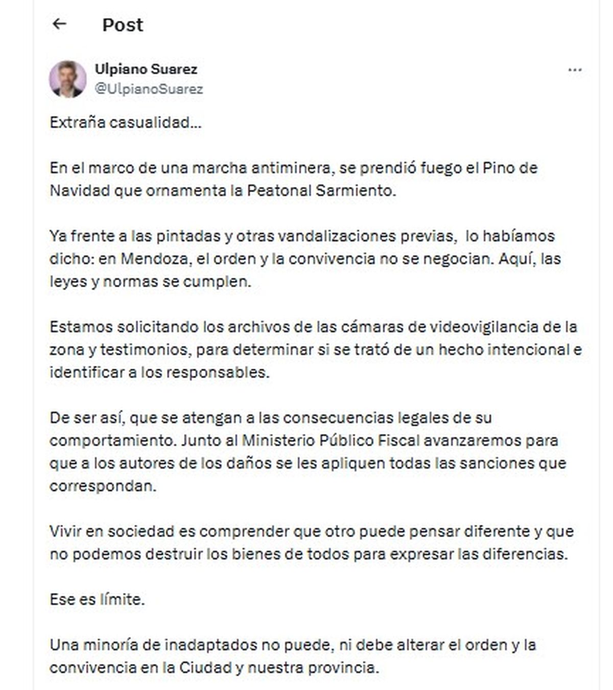 "Extraña casualidad... En el marco de una marcha antiminera, se prendió fuego el pino de Navidad que ornamenta la Peatonal Sarmiento. Ya frente a las pintadas y otras vandalizaciones previas, lo habíamos dicho: en Mendoza, el orden y la convivencia no se negocian. Aquí, las leyes y normas se cumplen", posteó el jefe de la Ciudad de Mendoza.
