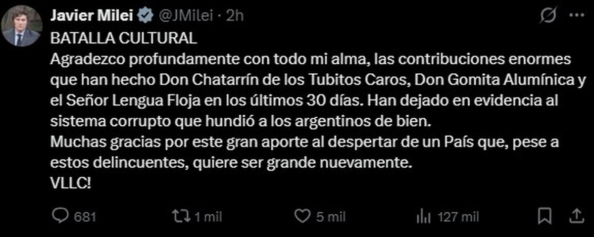 Con una publicación en su cuenta de la red social X, Milei mencionó irónicamente a “Don Chatarrín” por Paolo Rocca, de Techint; “Don Gomita Alumínica” por Javier Madanes Quintanilla, de Fate; y Señor Lengua Floja por Roberto Méndez, de Neumen.
