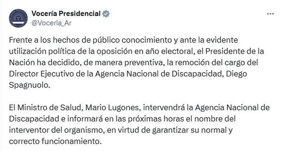 A través de la cuenta de Vocería, agregó: “El ministro de Salud, Mario Lugones, intervendrá la Agencia Nacional de Discapacidad e informará en las próximas horas el nombre del interventor del organismo, en virtud de garantizar su normal y correcto funcionamiento”.