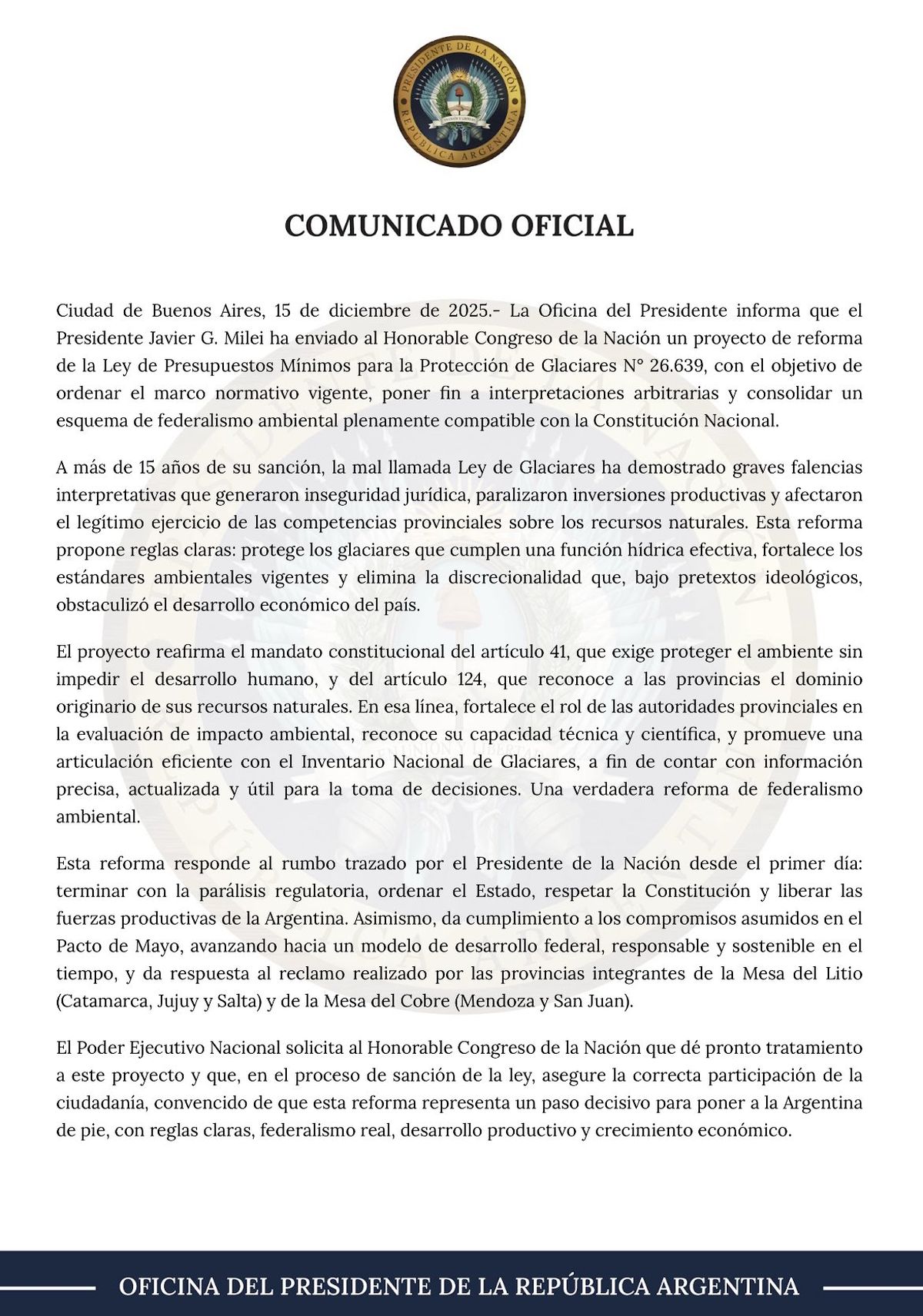 El presidente Javier Milei envió al Congreso un proyecto de ley para modificar la Ley de Glaciares, con el objetivo de reformar el régimen vigente desde 2010. A través de un comunicado difundido por la Presidencia, el Gobierno sostuvo que la norma actual presenta “graves falencias” y que, “bajo pretextos ideológicos, se obstaculizó el desarrollo del país”.