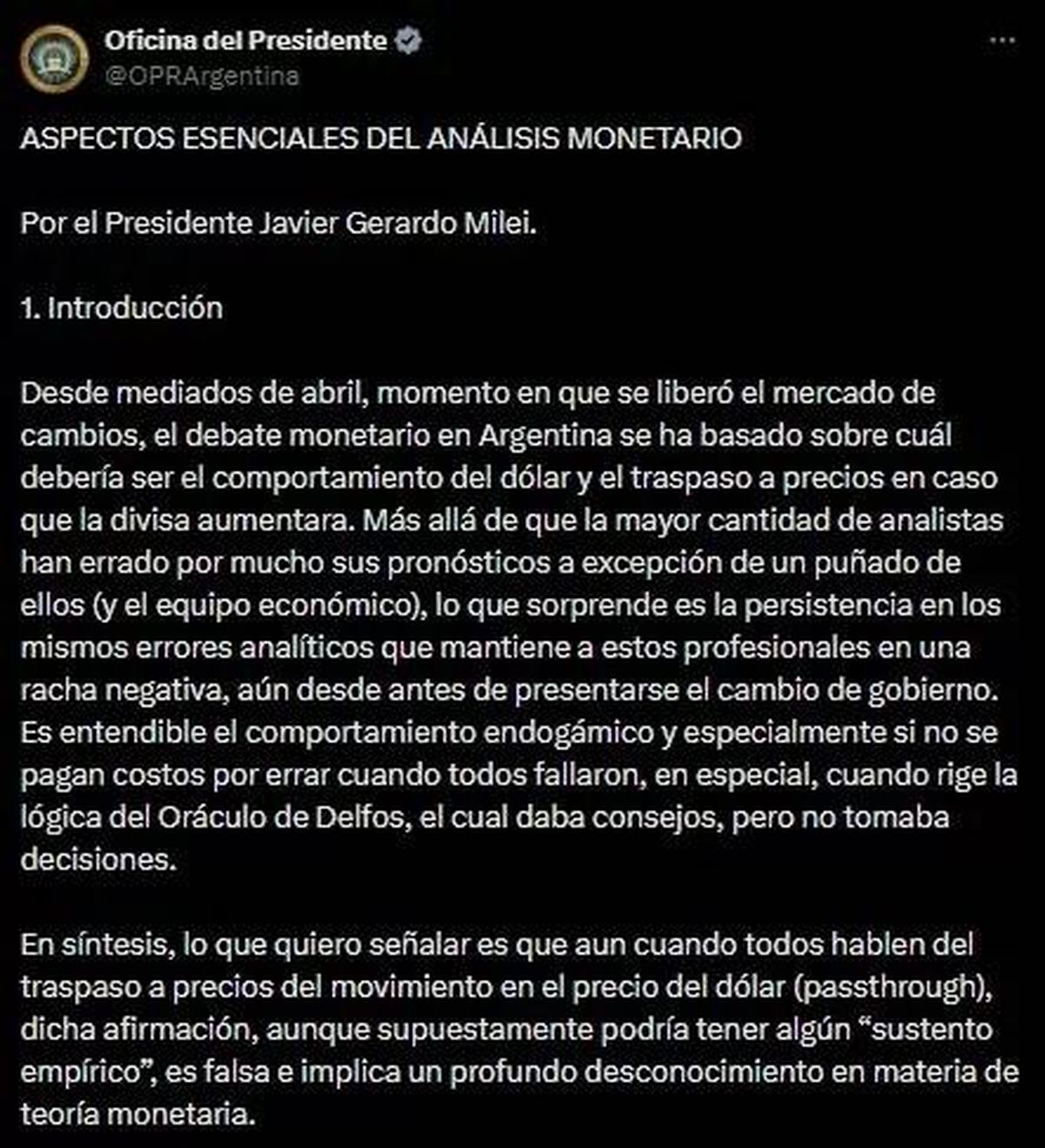 Mediante una publicación titulada "Aspectos esenciales del análisis monetario", Milei desarrolló una exposición de cinco puntos en la que citó a varios teóricos de la economía para resaltar la importancia de la política monetaria y señalar cuáles son los determinantes del nivel de precios.
