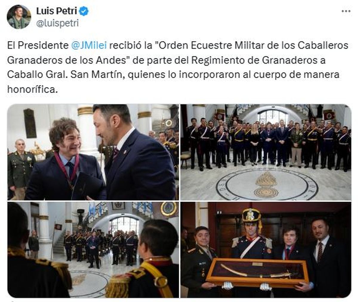 El presidente Javier Milei recibió este domingo la "Orden Ecuestre Militar de los Caballeros Granaderos de los Andes", otorgada por el Regimiento de Granaderos a Caballo General San Martín, quienes lo incorporaron al cuerpo de manera honorífica.