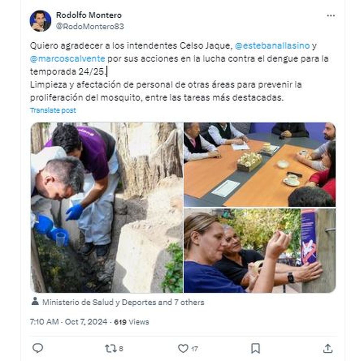 Montero recordó que el 25 de septiembre pasado junto al gobernador le presentaron a los intendentes el Plan de Abordaje 2024-2025 elaborado para trabajar sobre la problemática del dengue y en paralelo se les pidió que colaboraran con la limpieza de los espacios verdes de sus comunas.