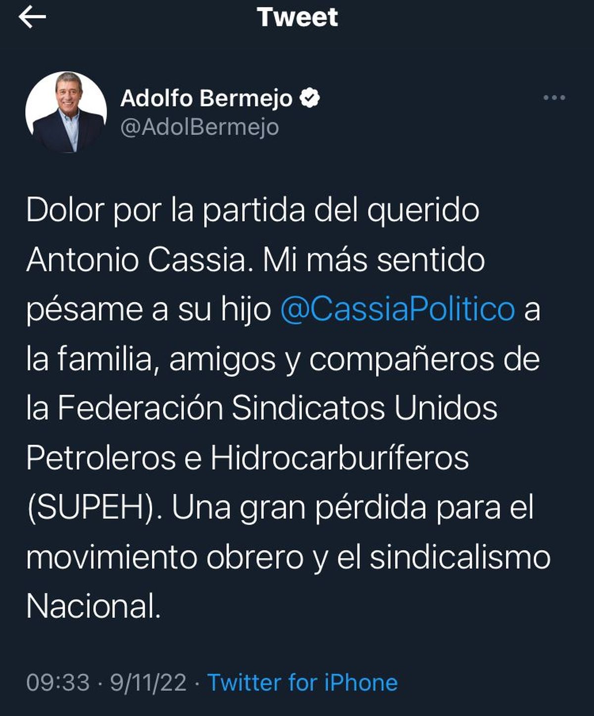 Adolfo Bermejo, diputado nacional por Mendoza y exintendente de Maipú, lamentó el fallecimiento de Antonio Cassia y se expresó en las redes sociales: "Dolor por la partida del querido Antonio Cassia. Mi más sentido pésame a su hijo Daniel, a la familia, amigos y compañeros de la Federación Sindicatos Unidos Petroleros e Hidrocarburíferos (SUPEH)". "Una gran pérdida para el movimiento obrero y el sindicalismo nacional", tuiteó.