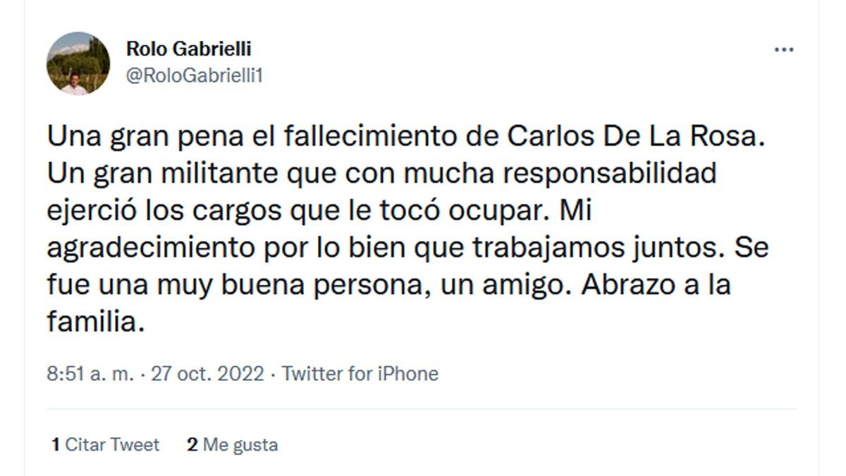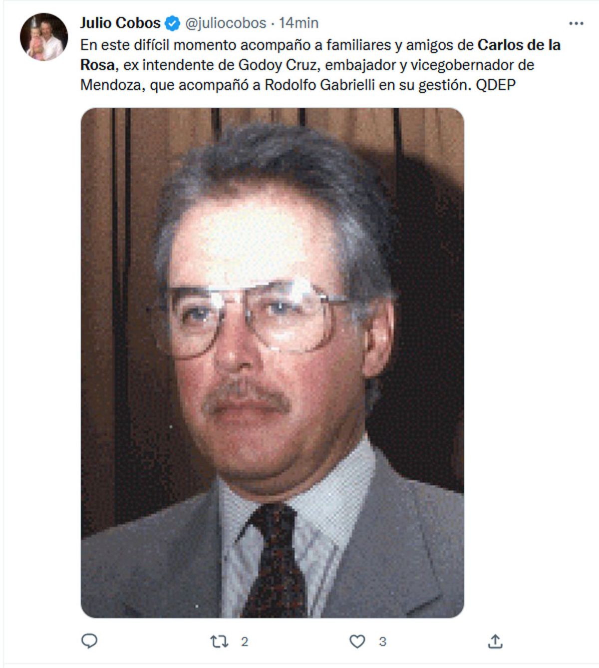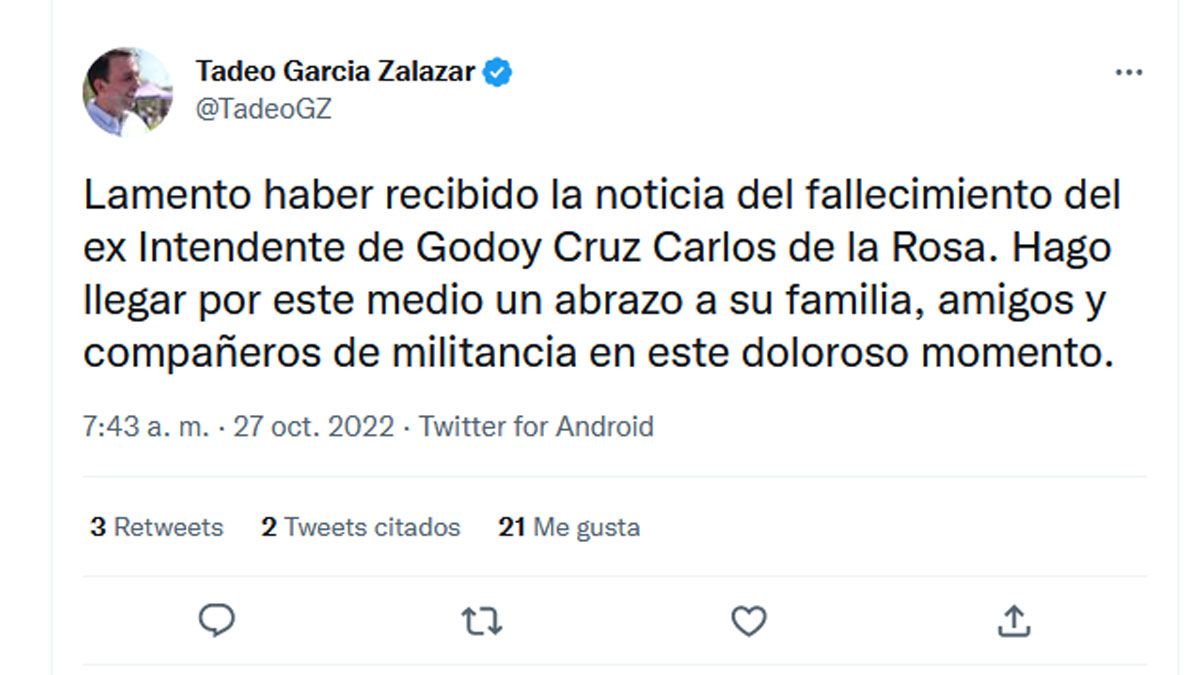 Tadeo García Zalazar, intendente de Godoy Cruz, fue uno de los primeros en lamentar la muerte de Carlos de la Rosa y envió sus condolencias a la familia y allegados.