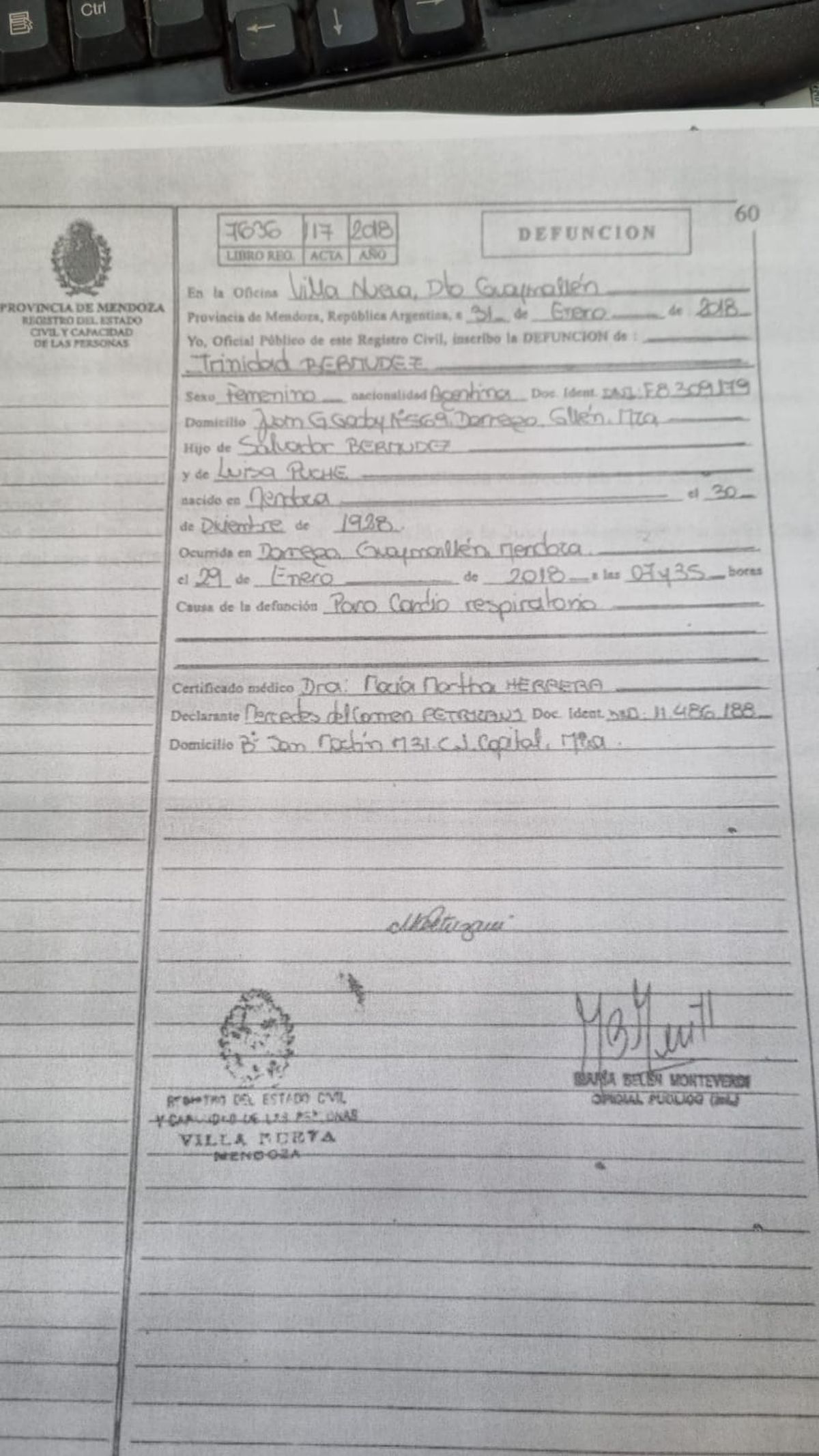 En este caso puntual, la defunción de Trinidad Bermúdez se cargó en la Oficina del Registro de Civil de Villa Nueva, en Guaymallén el 31 de Enero del 2018, sin embargo al parecer ese certificado nunca llegó al Renaper y mucho menos debió arribar a la Cámara Nacional Electoral. Sólo así se entendería que Trinidad siga apareciendo en el padrón electoral de Guaymallén.