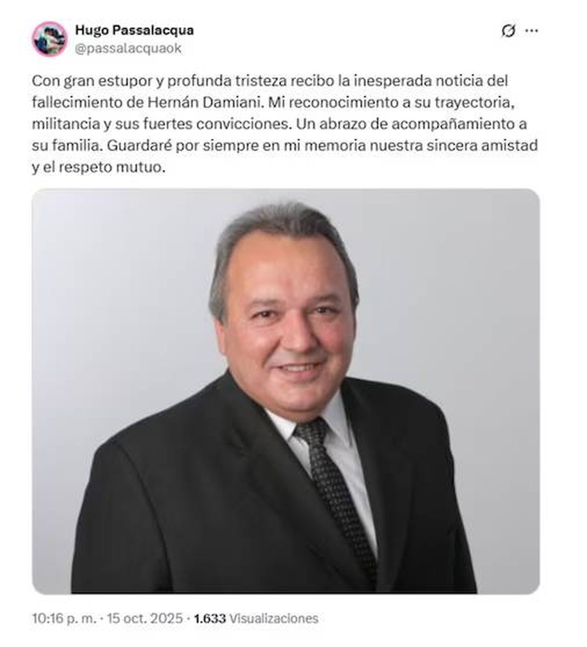 Por su parte, el gobernador de la provincia, Hugo Passlacqua, escribió en su cuenta de X: “Con gran estupor y profunda tristeza recibo la inesperada noticia del fallecimiento de Hernán Damiani. Mi reconocimiento a su trayectoria, militancia y sus fuertes convicciones. Un abrazo de acompañamiento a su familia. Guardaré por siempre en mi memoria nuestra sincera amistad y el respeto mutuo”.