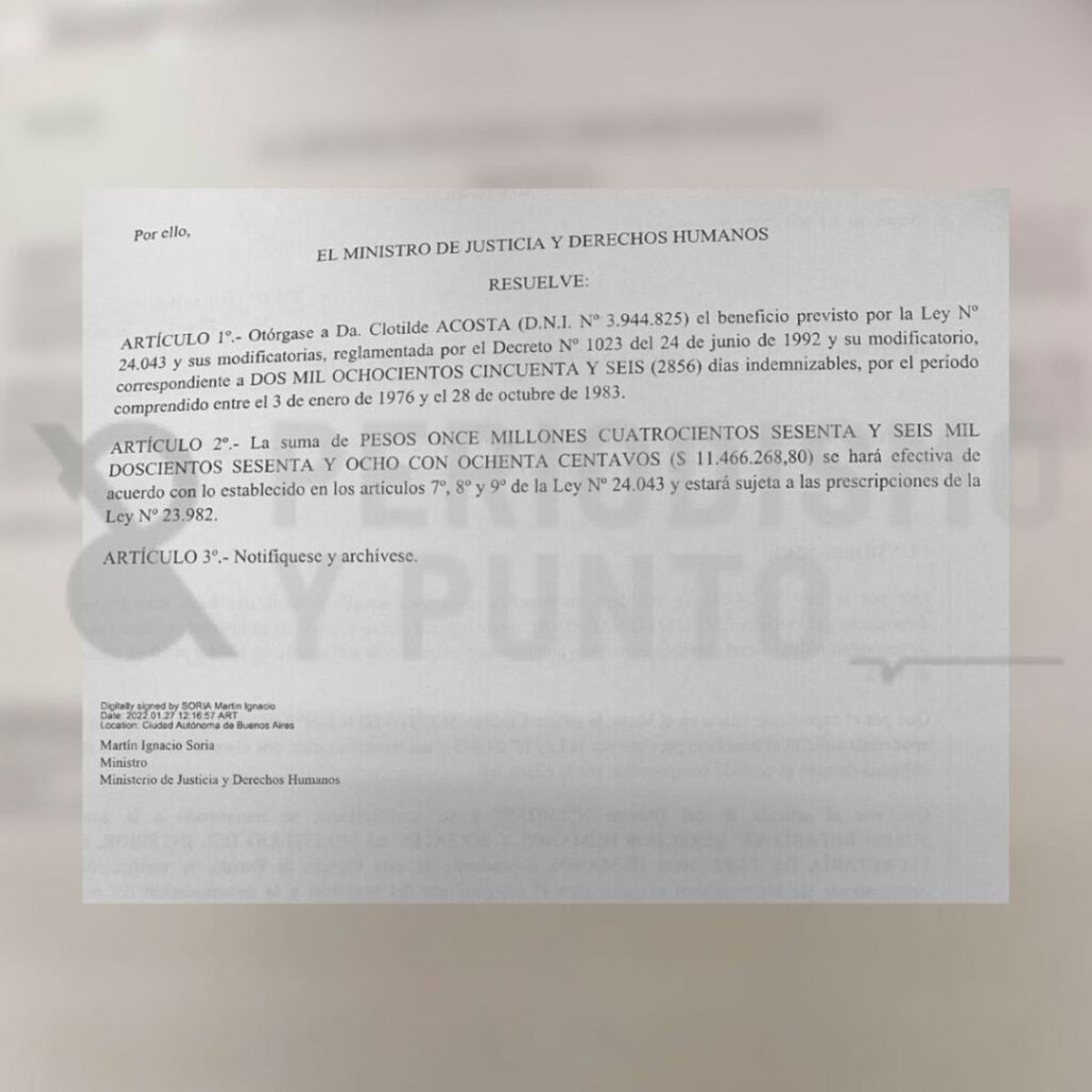 El texto del documento, que fue publicado por el portal Periodismo y Punto, reza: "Otórgase a Da. Clotilde ACOSTA (D.N.I. N° 3.944.825) el beneficio previsto por la Ley N° 24.043 y sus modificatorias, reglamentada por el Decreto N° 1023 del 24 de junio de 1992 y su modificatorio, correspondiente a DOS MIL OCHOCIENTOS CINCUENTA Y SEIS (2856) días indemnizables, por el período comprendido entre el 3 de enero de 1976 y el 28 de octubre de 1983".