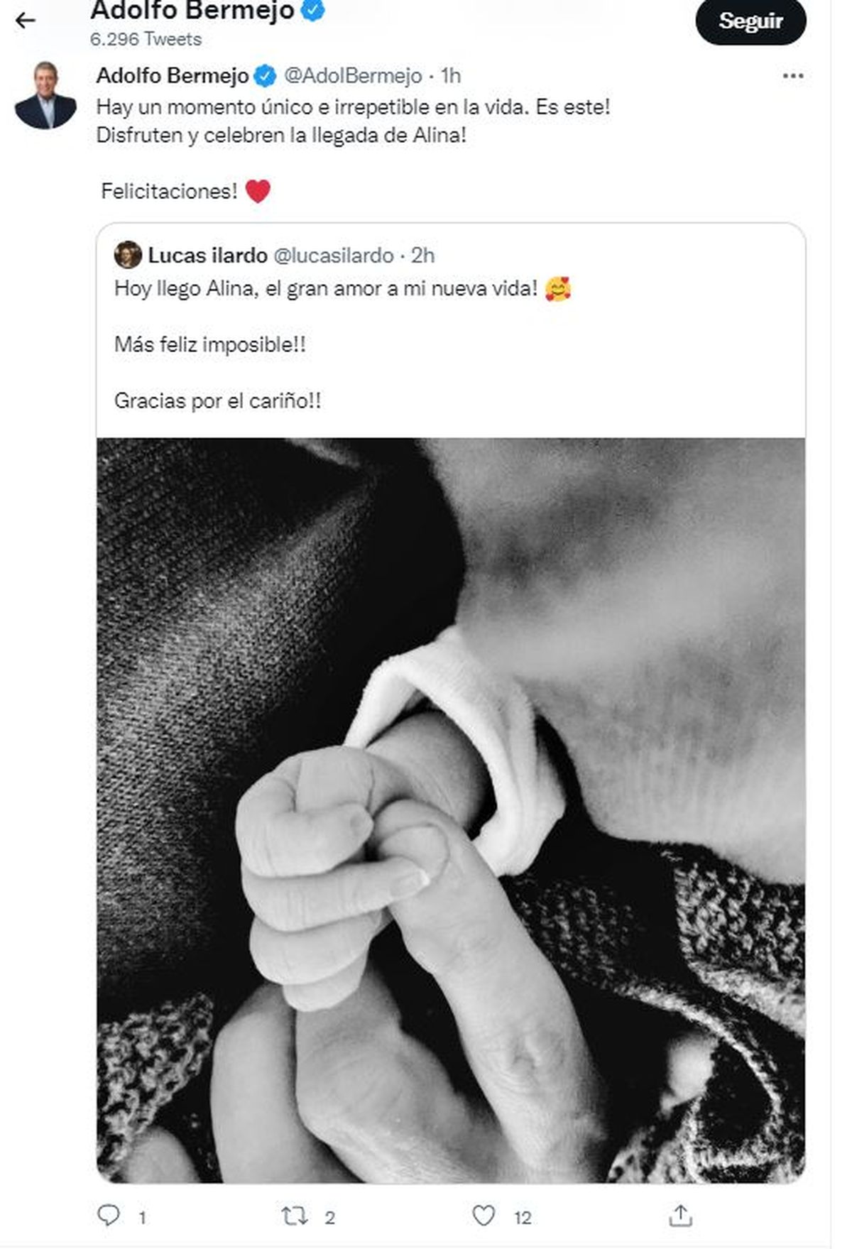Infinidad de salutaciones fue recibiendo el dirigente kirchnerista con el correr del día, como la del diputado nacional Adolfo Bermejo, quien acompañó su posteo con la foto que el flamante papá publicó de Alina.