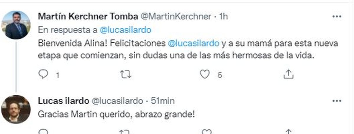 Rápidamente, uno de los primeros en congratularlo fue precisamente Kerchner, que le dijo a su colega: "Bienvenida Alina. Felicitaciones a Lucas Ilardo y a la mamá de la niña para esta nueva etapa que comienzan, sin dudas una de las más hermosas de la vida".