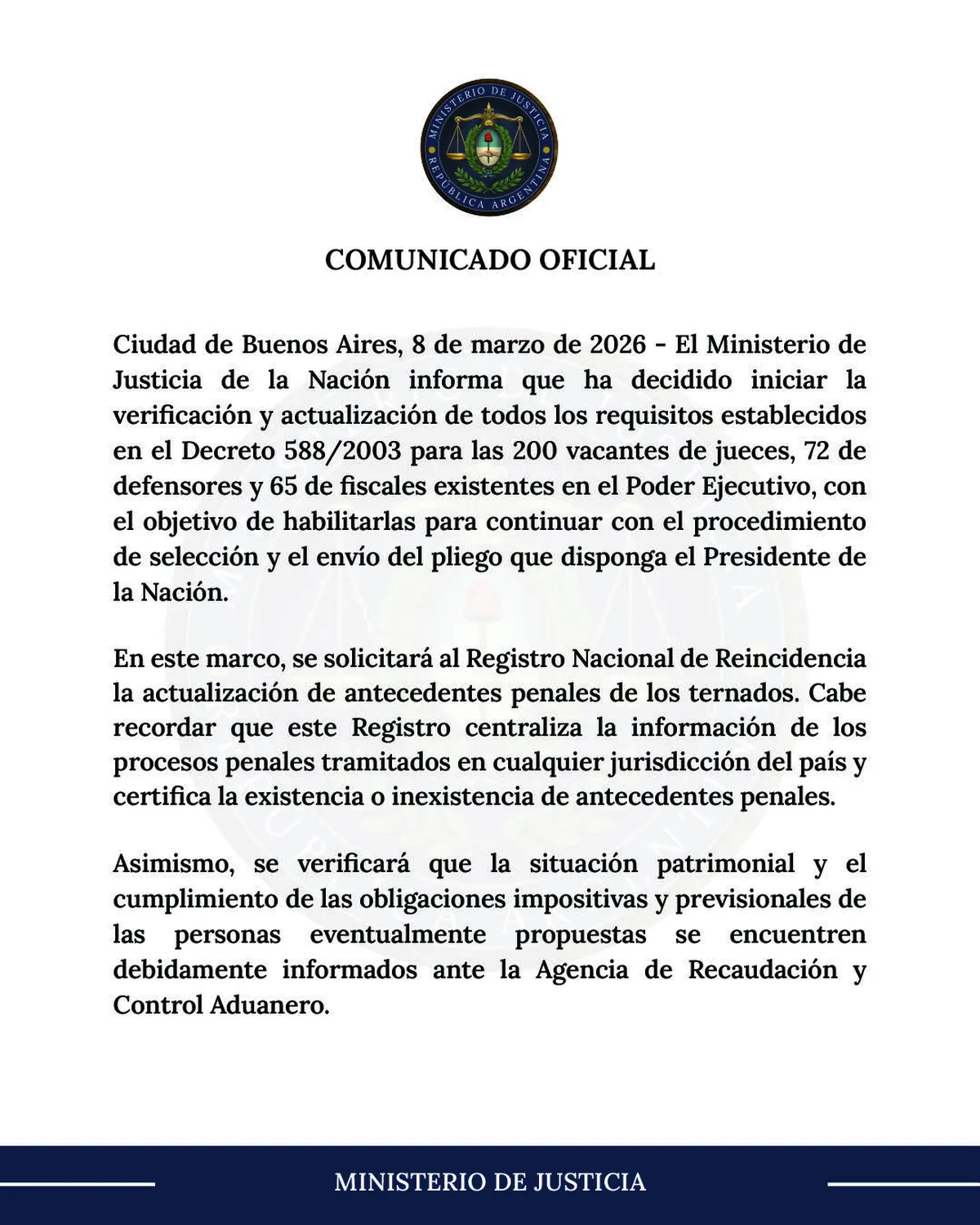 Según informó el ministerio, el proceso incluye la verificación de antecedentes a través del Registro Nacional de Reincidencia y la revisión patrimonial de los candidatos propuestos por el Consejo de la Magistratura de la Nación Argentina. Los pliegos serán enviados al Senado de la Nación Argentina, donde el oficialismo de La Libertad Avanza deberá reunir mayorías calificadas para avanzar con las designaciones, sobre todo de jueces.