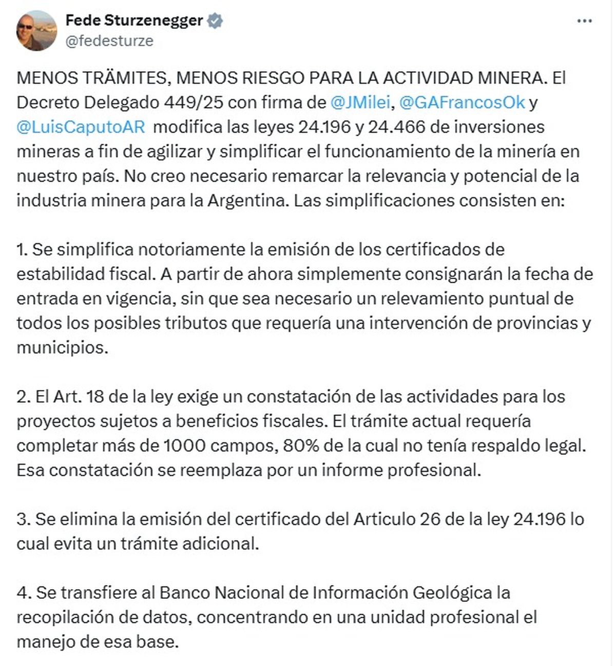 El ministro de Desregulación del gobierno Milei, Federico Sturzenegger, celebró la medida en la red social X: