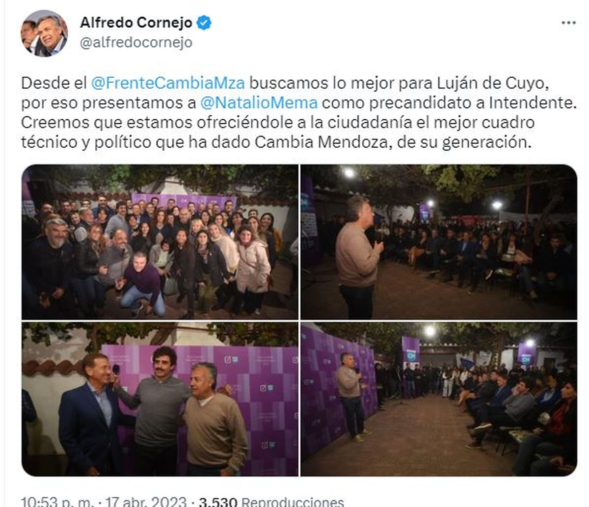 El senador nacional y precandidato a gobernador de Mendoza, Alfredo Cornejo, destacó en las redes que "desde el frente Cambia Mendoza buscamos lo mejor para Luján de Cuyo, por eso presentamos a Natalio Mema como precandidato a intendente. Creemos que estamos ofreciéndole a la ciudadanía el mejor cuadro técnico y político que ha dado Cambia Mendoza en su generación".