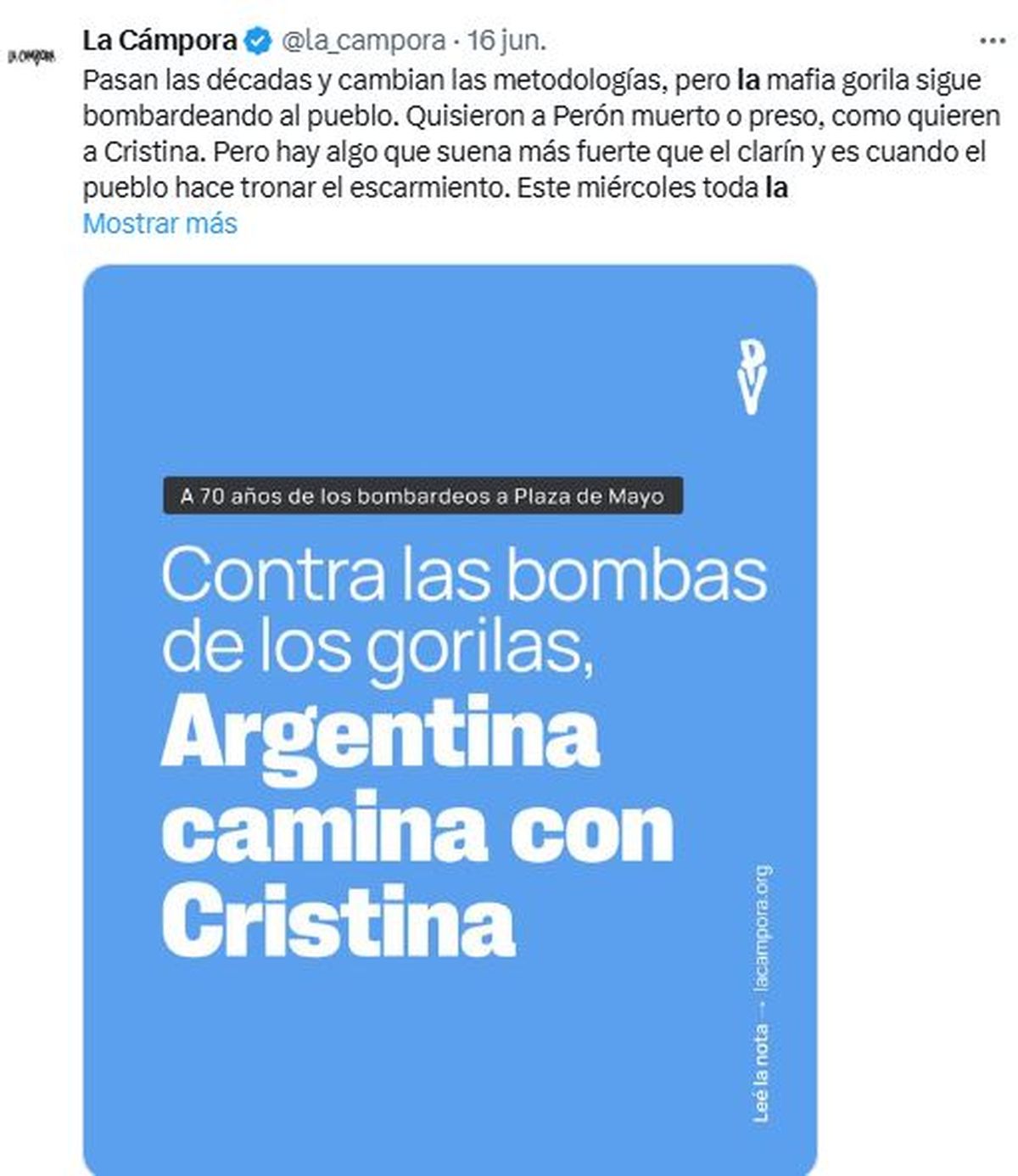 “En ella se expresa el proyecto histórico del peronismo de independencia económica, soberanía política y justicia social. Cristina representa la fuerza de Argentina. Los argentinos y argentinas la acompañan porque ella los acompañó siempre. Por eso, contra cualquier operación e intento de desinformar, el miércoles, vamos a reventar las calles para acompañarla a Comodoro Py y hasta que vuelva a su casa”, concluyó.