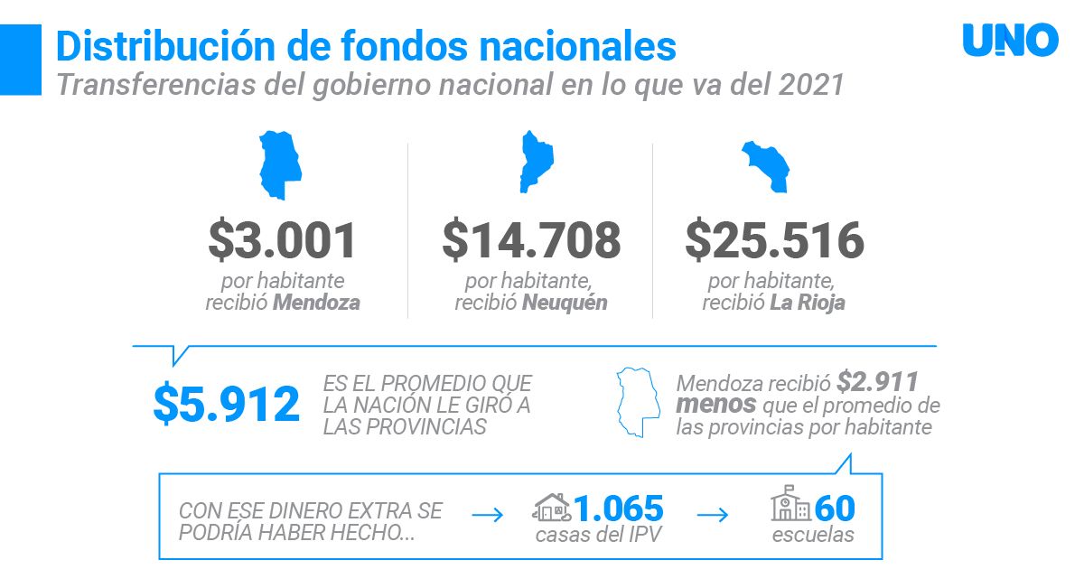 "En esto no caben las interpretaciones, son estadísticas oficiales. Según lo publicado en la Oficina Nacional de Presupuesto, en donde figuran las transferencias presupuestarias que hizo la Nación a las provincias, hasta julio Mendoza recibió per cápita, esto es por cada mendocino $3001, mientras que Neuquén recibió por cada neuquino $14.708 y La Rioja lidera el ránking ya que recibió por cada habitante $25.516. En promedio la Nación dio $5.912 per cápita a las provincias, por lo cual Mendoza recibió $2.911 menos por habitante, lo que multiplicado por los 2 millones de mendocinos da la suma de $5.800.000 menos" calculó el ministro mendocino y estimó que ese dinero "hubiese alcanzado para construir 1.065 casas del Instituto Provincial de la Vivienda o construir 60 escuelas".