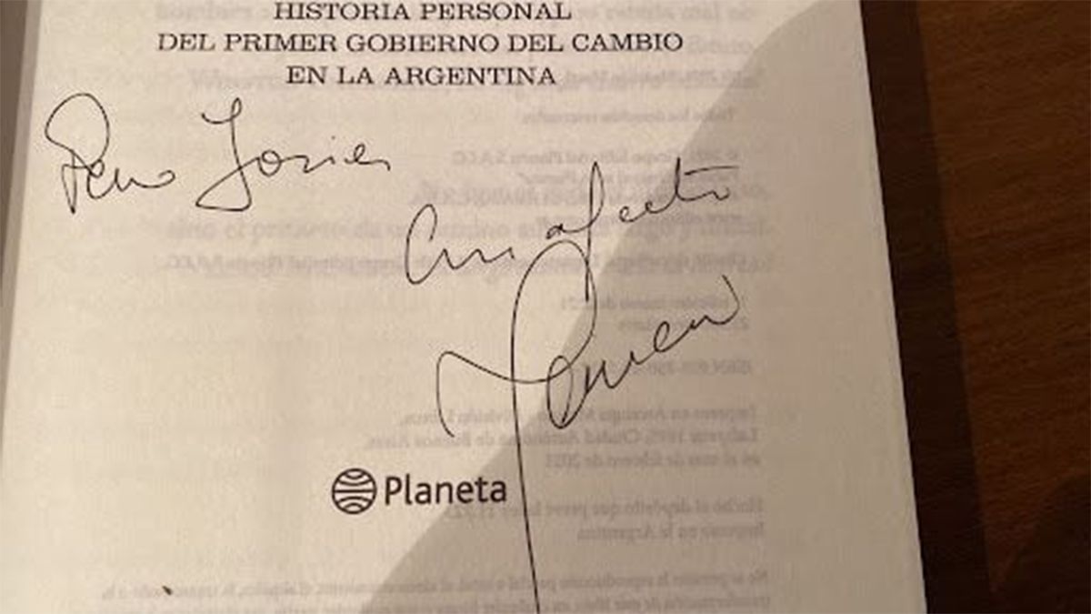 Además, Gómez Repetto envió a Reverso una foto de una dedicatoria realizada por Macri en su libro “Primer Tiempo” para demostrar que la letra no coincide con la atribuida en C5N.