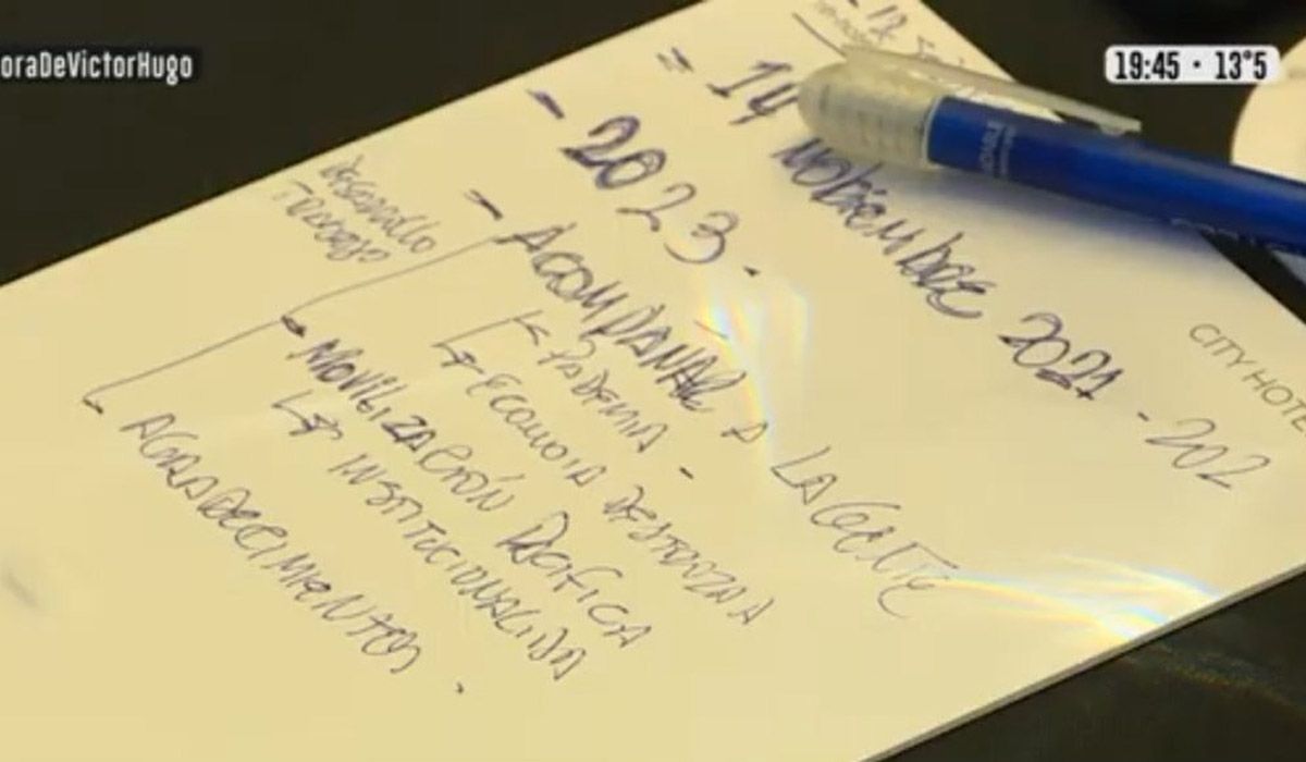 Una vez que se retiraron del lugar que compartieron dirigentes de la Coalición Cívica, la Unión Cívica Radical y el Pro, un camarógrafo de C5N registró los apuntes escritos, presuntamente por el ex presidente Mauricio Macri. En la hoja, las anotaciones comienzan con la fecha de las próximas elecciones con un error ortográfico: "14 de nobiembre", en vez de "noviembre".