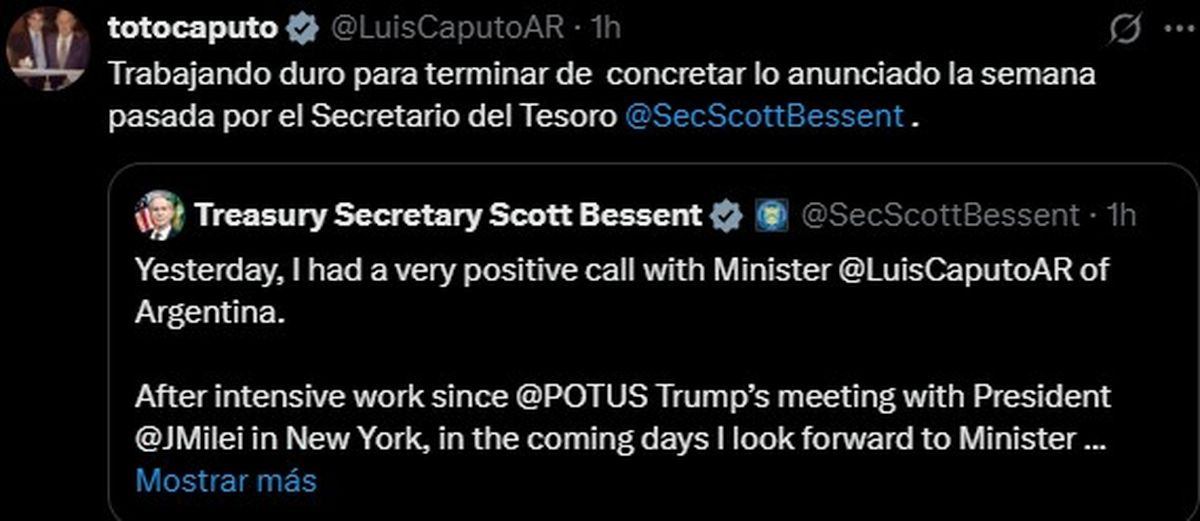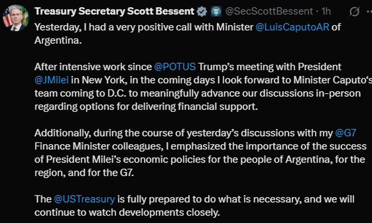 “Después de un intenso trabajo desde la reunión del presidente Donald Trump con el presidente Javier Milei en Nueva York, en los próximos días espero que el equipo del Ministro Caputo venga a DC para avanzar significativamente en nuestras discusiones en persona sobre las opciones para brindar apoyo financiero”, indicó Scott Bessent en una comunicación a través de redes sociales.