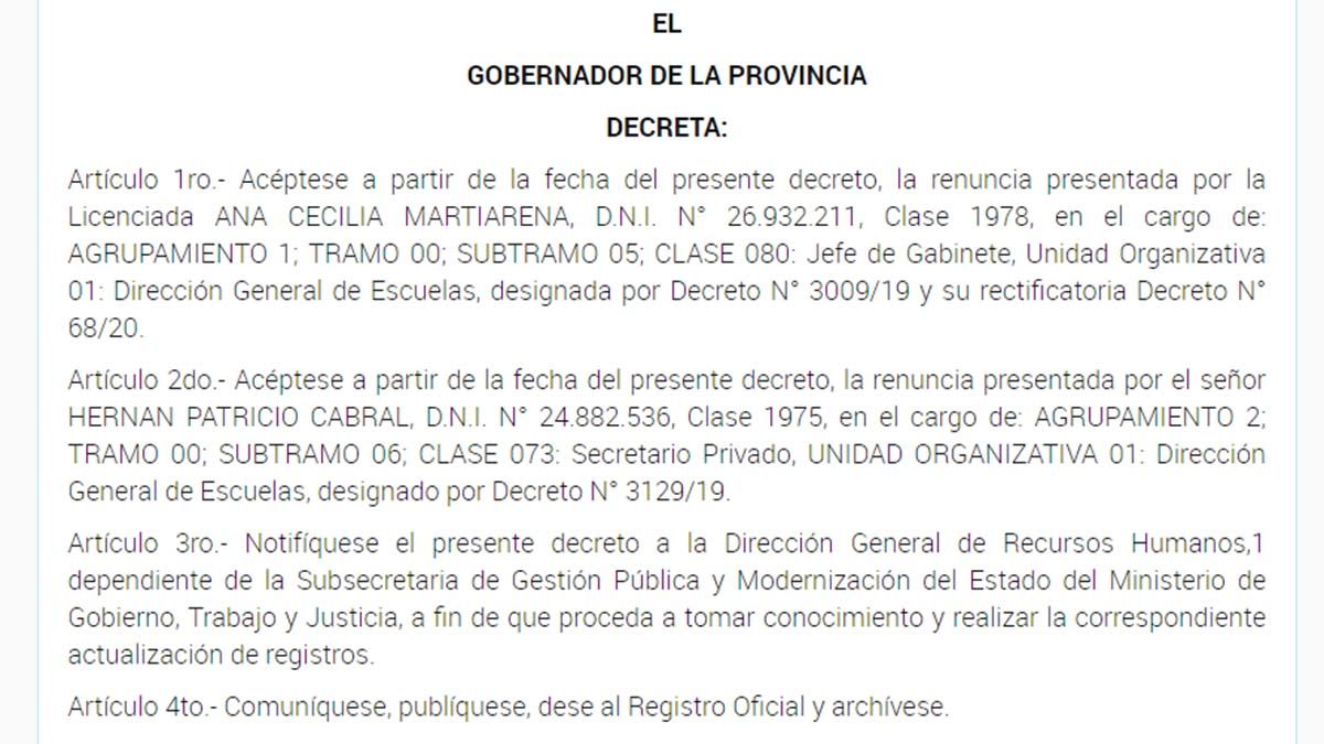 Se trata de las dimisiones de la que fue Jefa de Gabinete de la Dirección General de Escuelas, Ana Cecilia Martiarena y del secretario privado, Hernán Patricio Cabral.