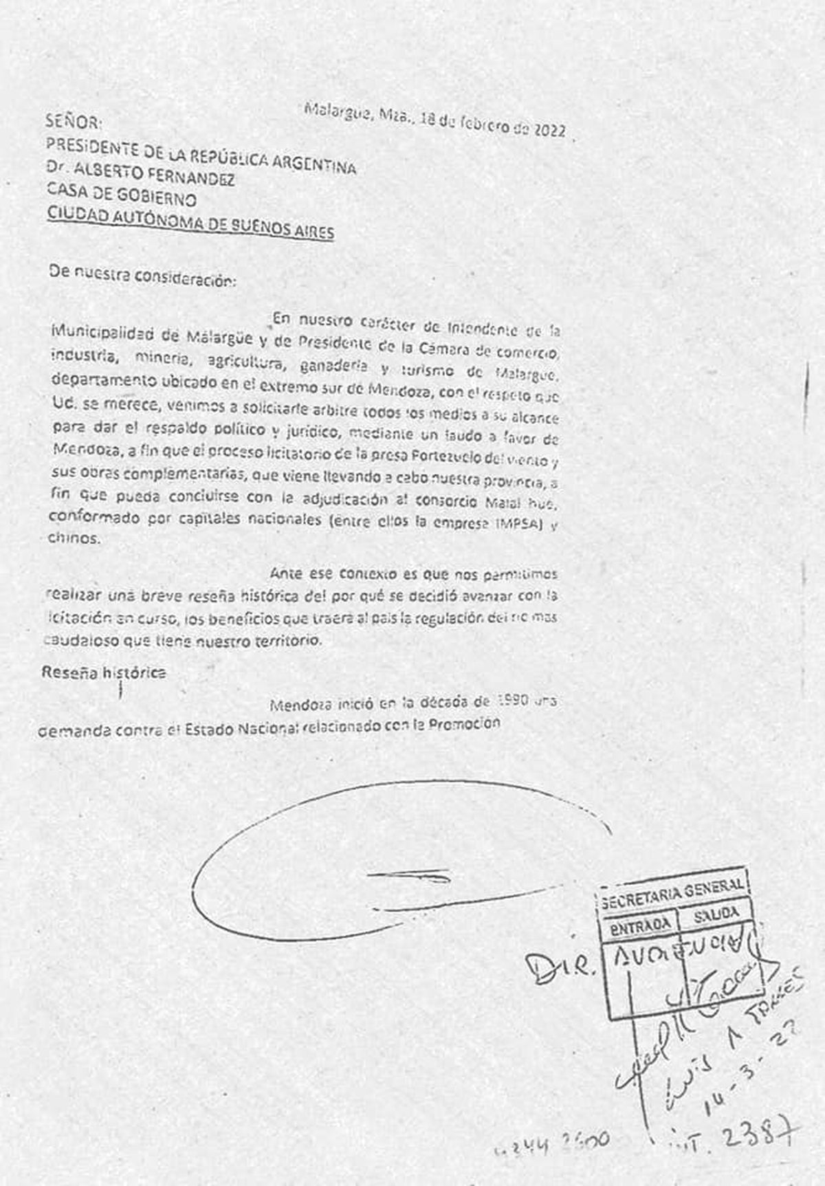 "Venimos a solicitarle arbitre todos los medios a su alcance para dar el respaldo político y jurídico mediante un laudo a favor de Mendoza, a fin de que pueda concluirse la adjudicación al consorcio Malal Hue, conformado por capitales nacionales -entre ellos la empresa IMPSA- y chinos", dice en su primera página la misiva, que lleva fecha del 18 de febrero: