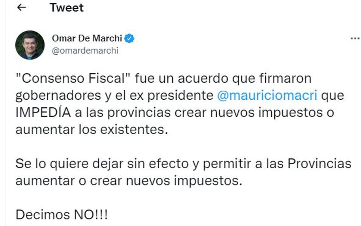 El diputado nacional Omar De Marchi adelantó que el bloque del PRO votará en contra del Consenso Fiscal, el cual debe tratarse en la Cámara Baja tras la media sanción que ya cosechó en el Senado de la Nación. Apuntaron en forma directa contra el kirchnerismo por "promover siempre el ajuste al sector privado con impuestos regresivos".