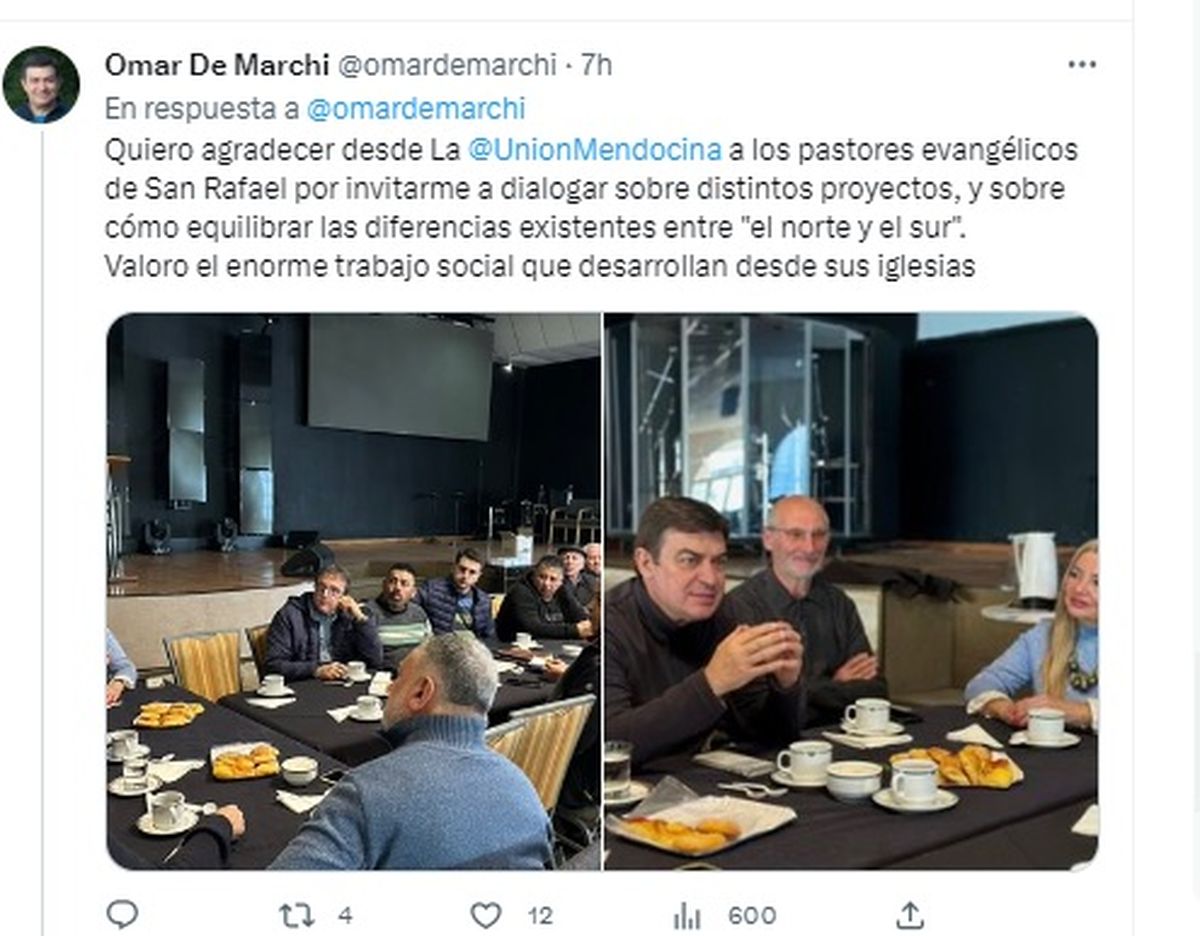 Durante la mañana de este sábado, De Marchi se reunió con pastores evangélicos. El encuentro estuvo coordinado por Víctor Doroschuk, un religioso del sur mendocino que se lanzó como candidato en las elecciones 2021 dentro del Partido Federal.