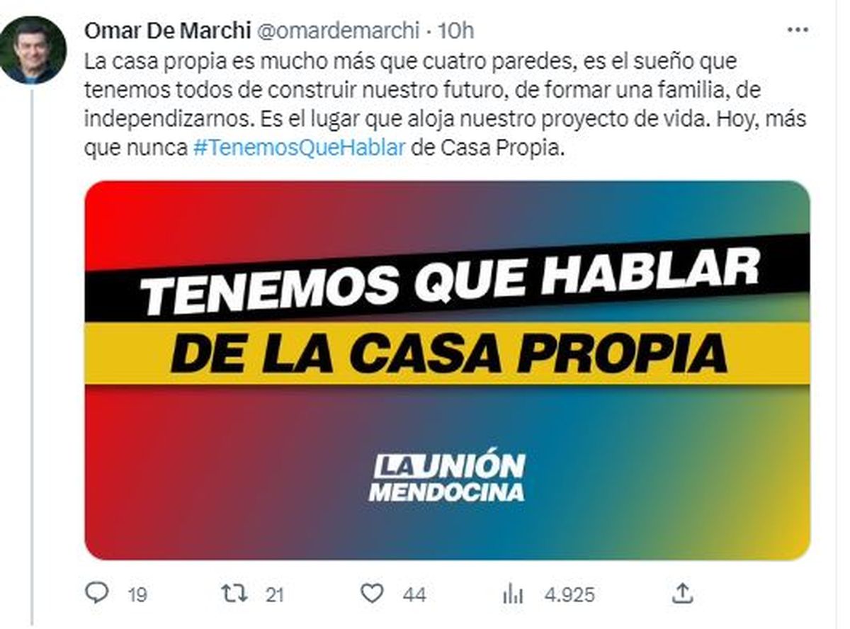 De Marchi instaló durante la jornada la consigna "tenemos que hablar de la casa propia", que llevó como hastag a las redes sociales. Aunque el tema de la vivienda ha sido el caballito de batalla de Omar Parisi, el precandidato a gobernador de Ahora Peronismo dentro del Frente Elegí.