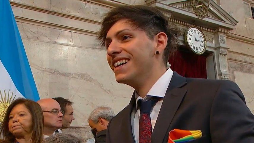 Estanislao Fernández, hijo del presidente Alberto Fernández, asistió a la ceremonia de traspaso de mandato vestido de gala, con un traje negro, corbata negra y camisa blanca. Pero lo que más llamó la atención fue un detalle: el pañuelo con los colores de la bandera LGBT que lució en el bolsillo del saco.