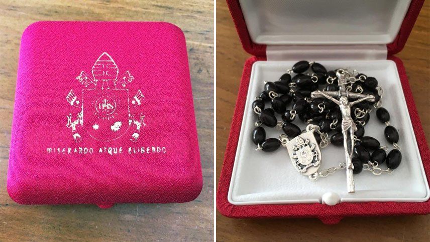 En las fotos se puede verse la cajita que contiene el rosario y el mismo, pero no algún escrito del papa.