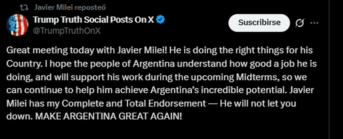 El presidente de Estados Unidos detalló: "¡Excelente reunión la de hoy con Javier Milei! Está haciendo lo correcto por su país. Espero que el pueblo argentino comprenda su excelente labor y que la apoye durante las próximas elecciones intermedias para que podamos seguir ayudándolo a alcanzar el increíble potencial de Argentina. Javier Milei tiene mi total apoyo. ¡No te dejará down. HACER ARGENTINA GRANDE DE NUEVO!".