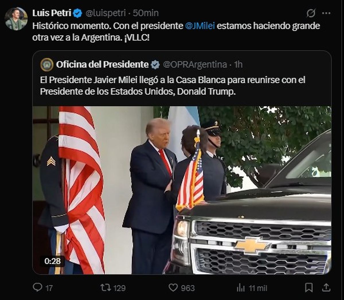 En sus redes sociales, Luis Petri escribió: "Histórico momento. Con el presidente Javier Milei estamos haciendo grande otra vez a la Argentina". En su breve mensaje, el mendocino agregó la clásica arenga del partido gobernante: "¡Viva la libertad carajo!".