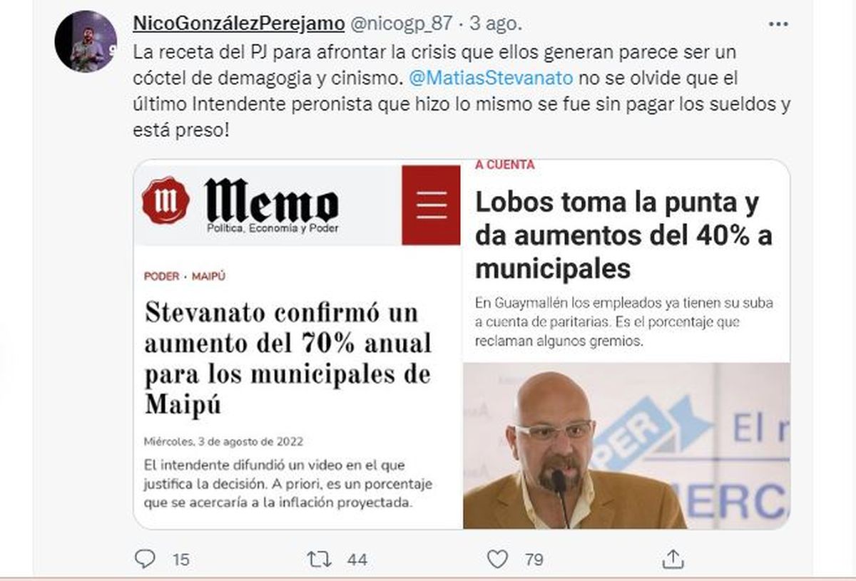 Apenas se divulgó el aumento del 70% que otorgó Stevanato a los municipales maipucinos, el primero en cuestionarlo fue el Secretario de Gobierno Guaymallén, Nicolás González Perejamo, quien usó su Twitter para marcar "la receta del PJ para afrontar la crisis que ellos generan era un cóctel de demagogia y cinismo".