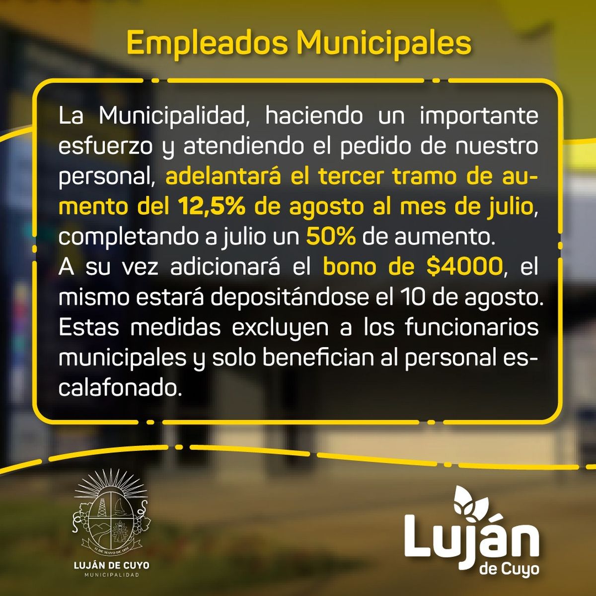 Así, los municipales lujaninos cobraron con el sueldo de julio un 12,5% de aumento. Con ese incremento al concluir julio el jefe comunal del Pro ya había liquidado a sus empleados un 50% de incremento: dio un 25% en marzo, otro 12.5% en mayo y el mismo porcentaje en julio. A eso se sumó un bono de $4.000 que se pagó en abril y junio y que se podría dar también en agosto, algo que se definirá el próximo 10 de agosto.