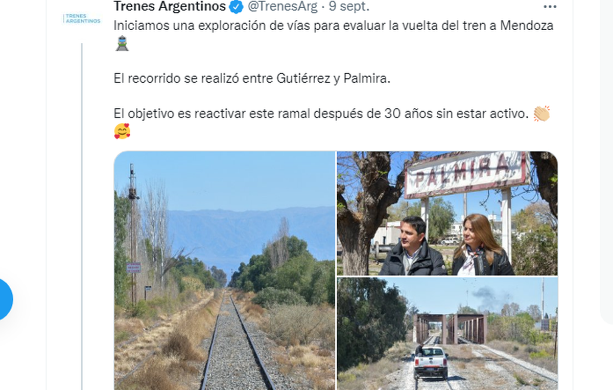 Marinucci destacó que hay mucha factibilidad para este retorno inmediato del tren, debido al estado de las vías que inspeccionaron, y que el tren de pasajeros llegará a la estación Gutiérrez, donde se podrá hacer trasbordo con el Metrotranvía para llegar a la ciudad de Mendoza. Es fundamental el tránsito de los trenes de carga hasta Palmira, lo que ha permitido el mantenimiento de los rieles, sin invasión de maleza, y usurpación.