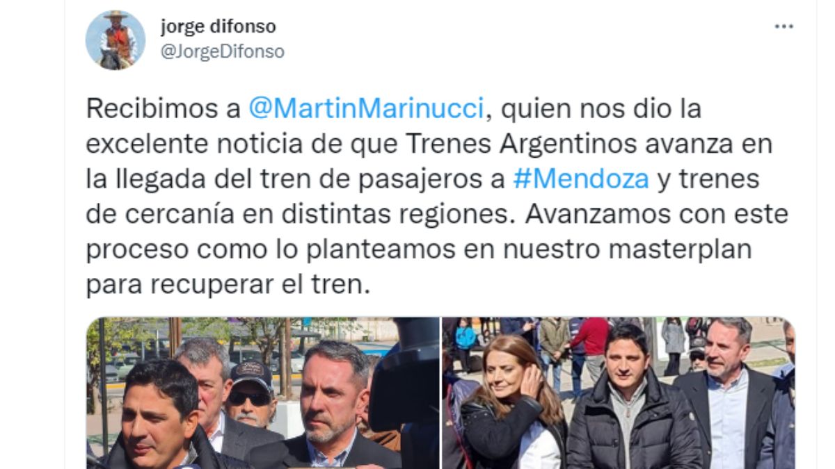 Nuestra provincia no es ajena al reclamo general, y en particular de muchas localidades alejadas de los grandes centros urbanos, del retorno del tren en Mendoza. Confirmando los dichos que hablan de la inminencia de esta vuelta, sobre el fin de esta semana, el propio presidente de la empresa Trenes Argentinos, Martín Marinucci hizo un visita para estudiar el tema.