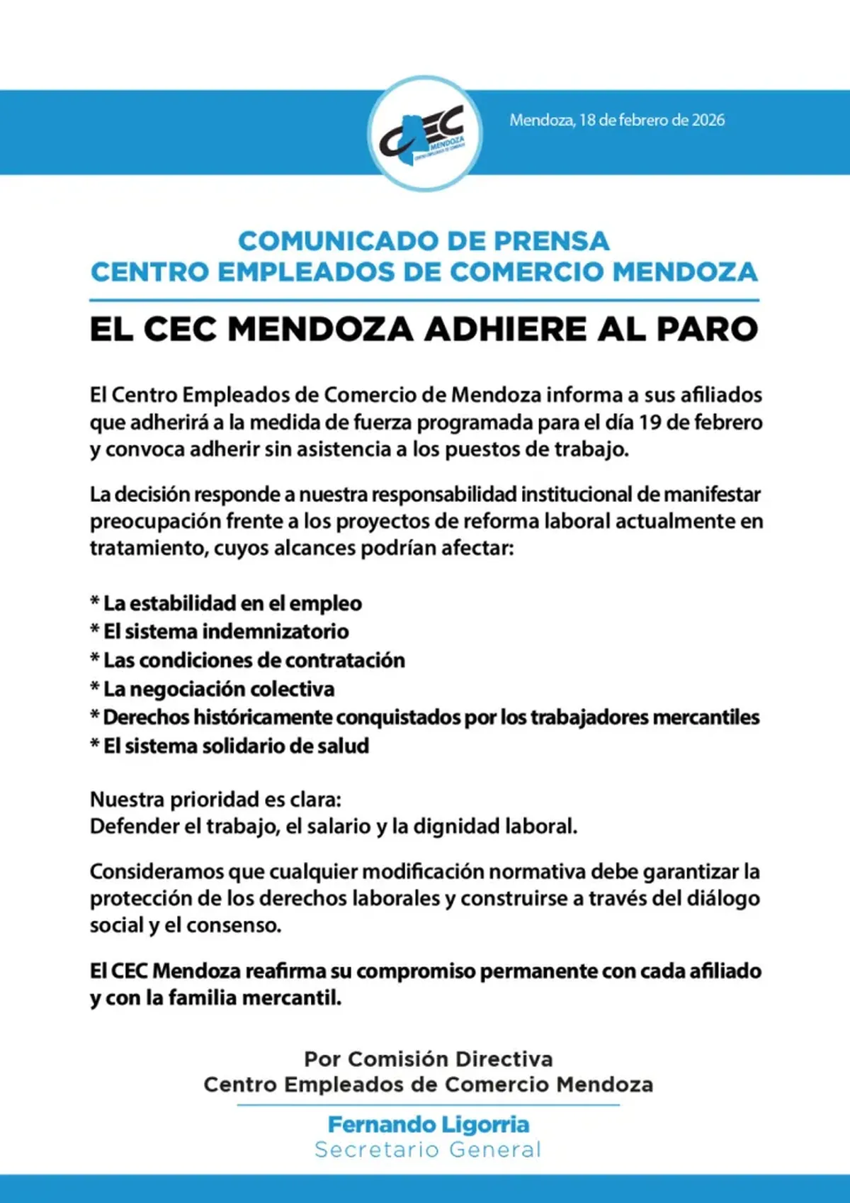 Gremios de Mendoza se suman este jueves al paro nacional convocado por la Confederación General del Trabajo (CGT) en rechazo a la reforma laboral impulsada por el gobierno que se trata en la jornada de hoy en la Cámara de Diputados.